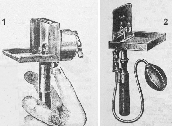 1) Blitzgeräte mit Zündplätzchen. Dabei konnte mit einen Blasebalg aus Gummi und Schlauchleitung ein Stift dazu verwendet werden, ein ein geeignet auf das Abbrennblech gelegtes Zündblättchen zum "Knallen" gebracht werden. Dieser Knall mit Minifeuer zündete dann das eigentliche Blitzpulver auf der Abbrennpfanne