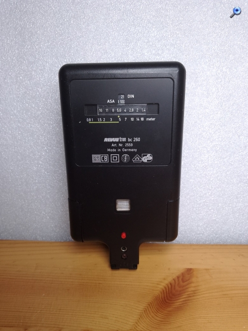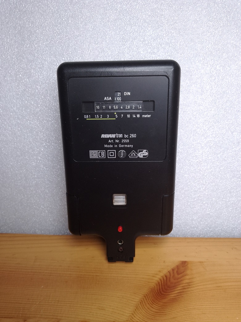 das REVUE tron bc 260 bietet die Möglichkeit manuell oder unterstützt von einem eingebauten Computer zu blitzen. Zur computergestützten Blitzlichtaufnahme ist die Meßzelle unterhalb des Lichtaustrittes mittels eines Schiebers zu öffnen. Nachdem auf der Rückseite des Blitzlichtgerätes die richtige Filmempfindlichkeit eingestellt worden ist (hier im Beispiel 21 DIN / 100 ISO) läßt sich über dem gelben Punkt der korrekte Blendenwert, der dann an der Kamera einzustellen ist, ablesen. Im Bereich der gelben Linie, also 0,8 - ca. 4,6 Meter, wird das Blitzlicht durch die Elektronik entsprechend dosiert. Möchte man auf die Hilfe durch den Computer verzichten und manuell "blitzen" ist die Meßzelle zu verschließen. Der richtige Blendenwert läßt sich nun über die Entfernungsskala auf der Rückseite ermitteln. In unserem Beispiel wäre dies bei einer Entfernung von 7 Metern die Blende 4.