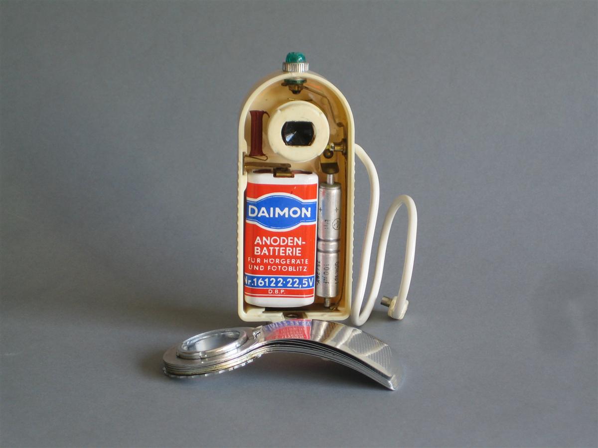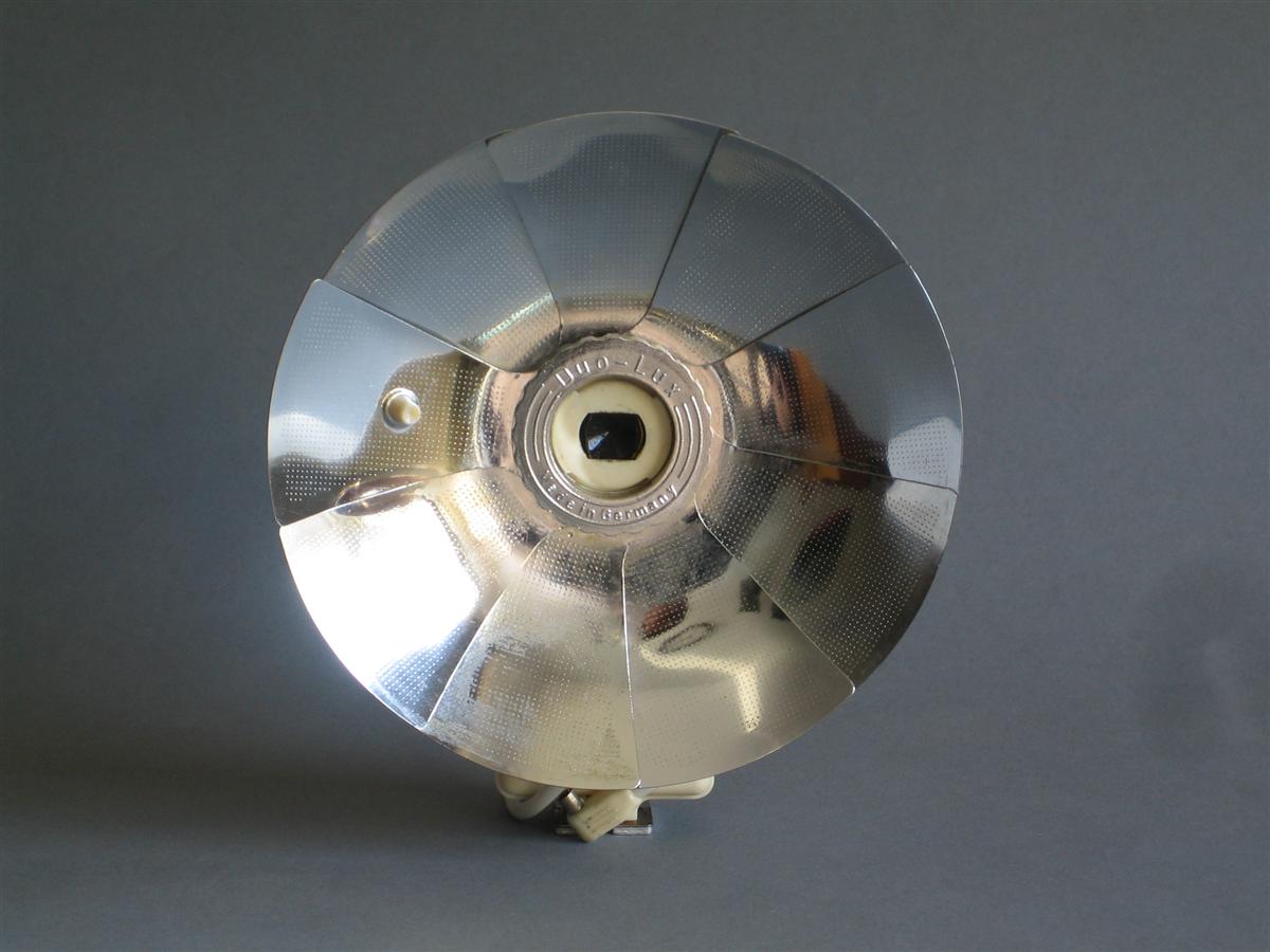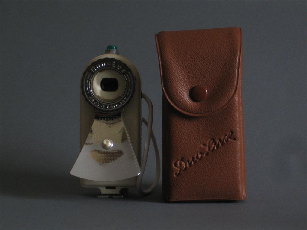 der nachfolgende Duo-Lux Fotobirnenblitz stammt vermutlich aus den 50er Jahren. Es können Blitzlampen der Typen PF1 und XM1 bzw. PF5 und XM5 verwendet werden. Die Kamera sollte auf 1/25 sec bzw. 1/30 sec gestellt werden, gezündet über das Kabel. Als Reichweite werden max. 6-8 m genannt bei 21 DIN. Stromversorgung erfolgt über eine 22,5 V Anoden-Batterie, z.B Daimon oder Pertrix; die elektr. Schaltung dürfte identisch sein mit dem von Rainer eingestellten Schaltplan eines vergleichbaren Gerätes. Auf der Rückseite befinden sich eine Blendentabelle und auf der Oberseite ein Kontrolllämpchen für die Blitzbirne. Der Reflektor ist zusammenlegbar und somit lässt sich das Gerät platzsparend im mitgelieferten Etui aufbewahren.