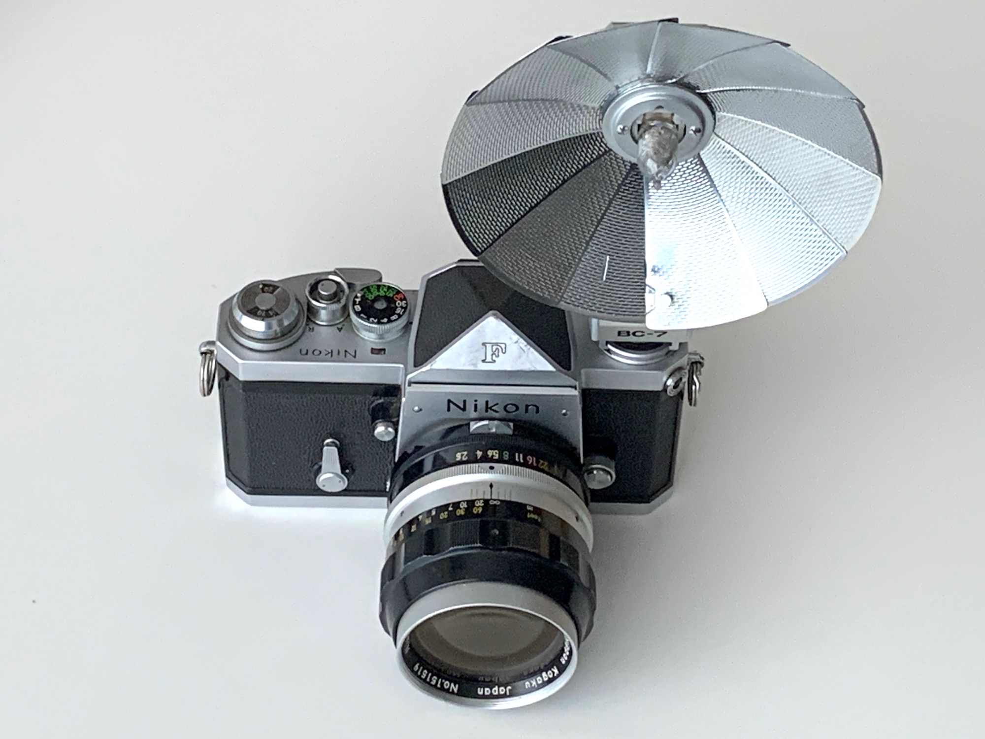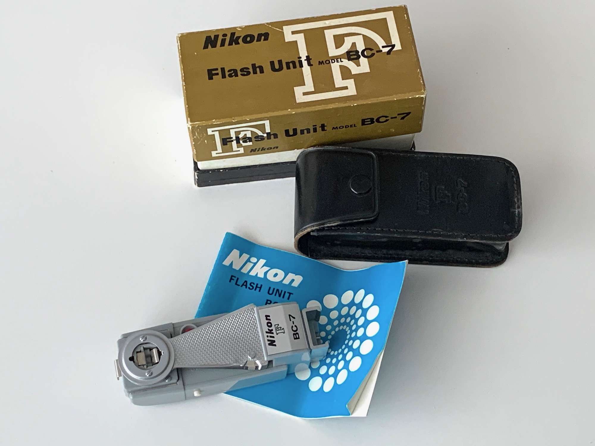vor dem Zeitalter der Elektronenblitze verwendete man Kolbenblitze wie den Nikon BC-7, ein handliches Gerät mit zusammenlegbarem Reflektor, das seit 1965 angeboten wurde. Bestimmt war er für die Nikon F, er wurde auf den dafür vorgesehen Zubehörschuh oberhalb der Rückspulkurbel geschoben.