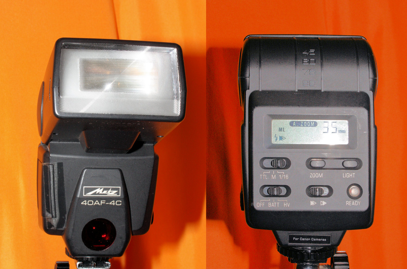 Auf oder neben der Kamera verwende ich meinen alten Metz 40AF-4C im manuellen Modus, da er zwar über TTL- aber noch nicht über E-TTL-Steuerung verfügt und deswegen nicht von der EOS 450D gesteuert werden kann. Aber zumindest die Funktionen der Brennweiteneinstellung wird übertragen und die Auslösung ist gefahrlos für die Kamera, da die Zündspannung unter 5 V liegt. Der Blitz lässt sich auf 1/8 Leistung umschalten: