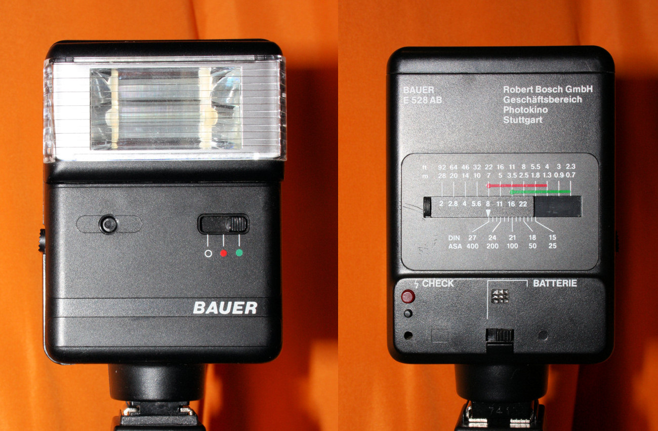 Weiter verwende ich noch zum Ausleuchten von Schlagschattenbereichen oder zum entfesselten Blitzen einen alten Bauer E 528 AB: