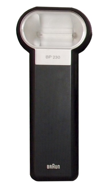 das Braun Hobby BP230 Blitzgerät mit Softlight-Reflektor (für gleichmäßige Ausleuchtung) für die Polaroid SX70 Sofortbildkamera und Kameras mit E-Blitzanschluß. Es kam um 1978 auf den Markt und hatte ein Spezial-Verbindungskabel zur SX70 und eine Montageschiene. Abmessungen: H 16 cm, B 7 cm, T 5 cm. Der große Abstand zum Objektiv verhindert "Rote Augen Effekte. Batteriebetrieb, nicht für Akkus.