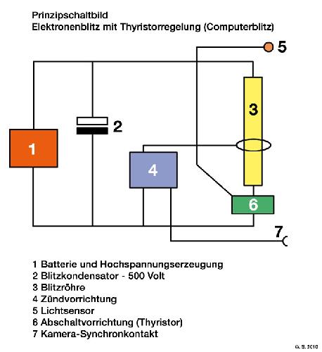 Der Vollständigkeit halber hier noch das Prinzipschaltbild eines Elektronenblitzgerätes mit automatischer Regelung der Blitzstärke (Computerblitz).