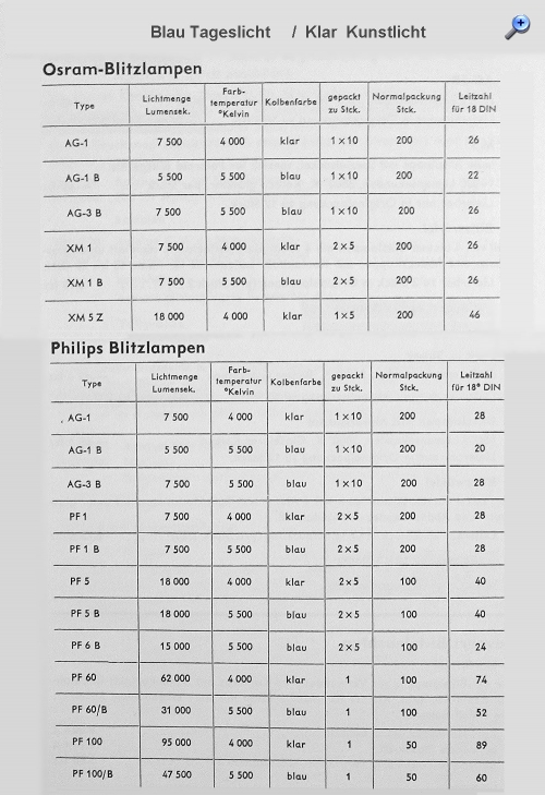 Blitzbirnen (Blitzlampen) wurden in klar weiss (für Kunstlicht- und schwarzweiss-Filme) und blau eingefärbt (für Tageslicht-Farbfilme) angeboten.