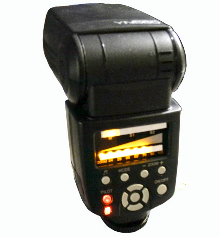 der sehr preiswerte manuelle Blitz hat eine brauchbare Leitzahl und kann mit 2 Sklavenblitz-Stufen bei Kameras ohne Blitzkontakt größere Räume ausleuchten.
