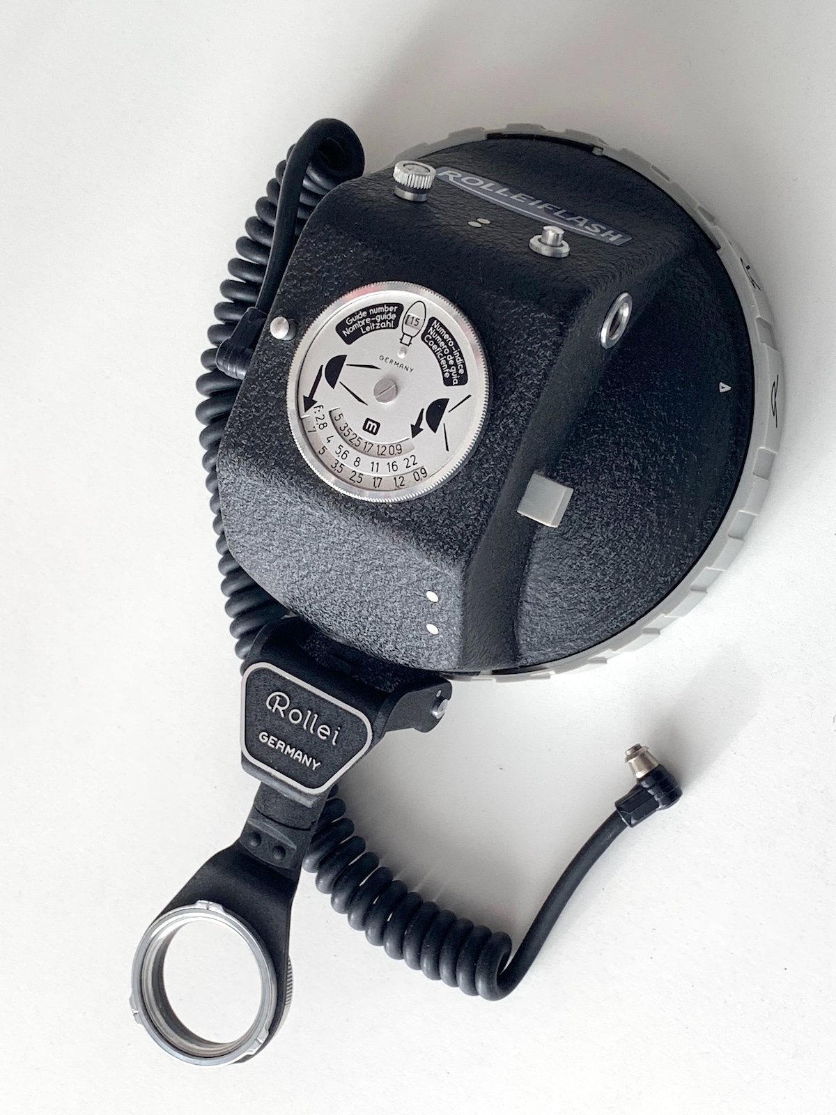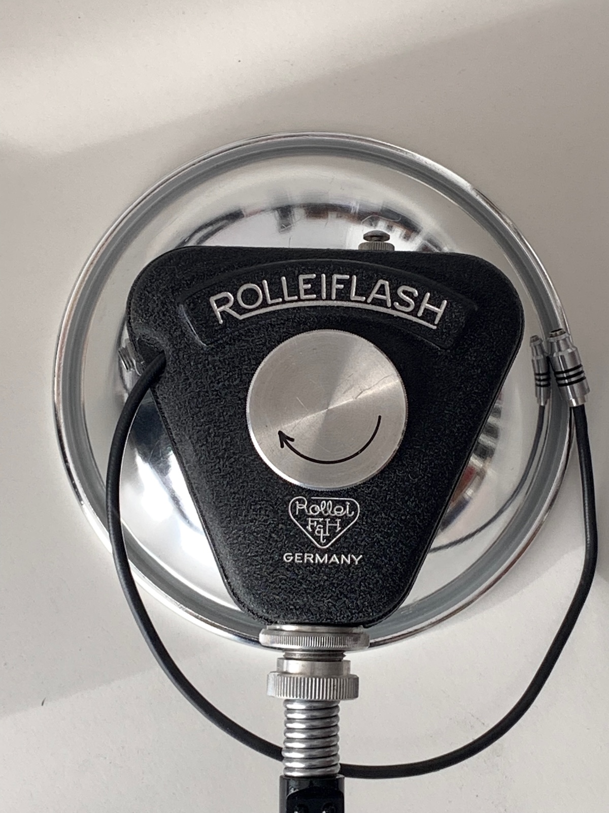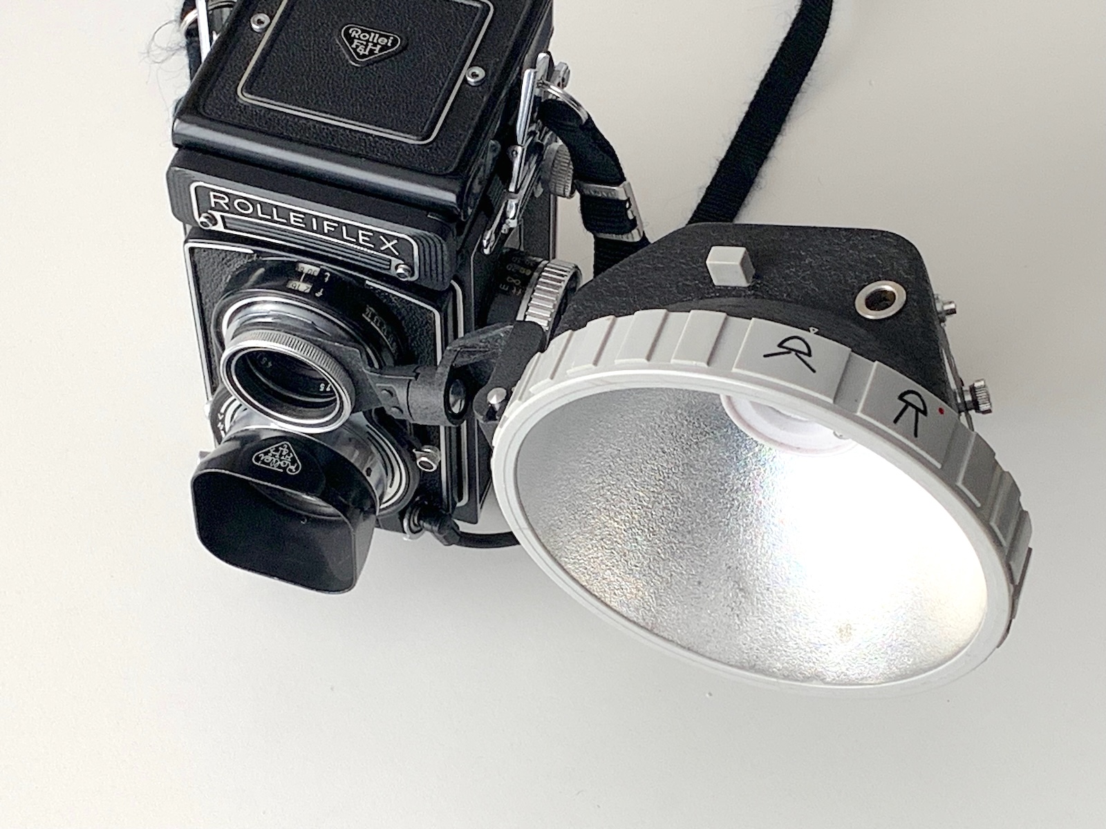 seit 1949 waren die Rollei-Kameras mit dem synchronisierten Compur ausgestattet, und mit der Ausbreitung von (Birnen-)Blitzgeräten wurde es erforderlich, auch ein entsprechendes Blitzgerät anzubieten. Das Gehäuse der Rolleiflex bzw. Rolleicord bot keinen Platz für einen Zubehörschuh. Der Rolleiflash 1, der nach ein paar Prototypen, über die Claus Prochnow im Rollei-Report II berichtet, 1952 auf den Markt kam, wurde am Bajonett des Sucherobjektivs befestigt. Illustriert wird das hier mit einer Rolleiflex 3,5 B (liegend, weil die Kombi ohne Stativ umfällt).