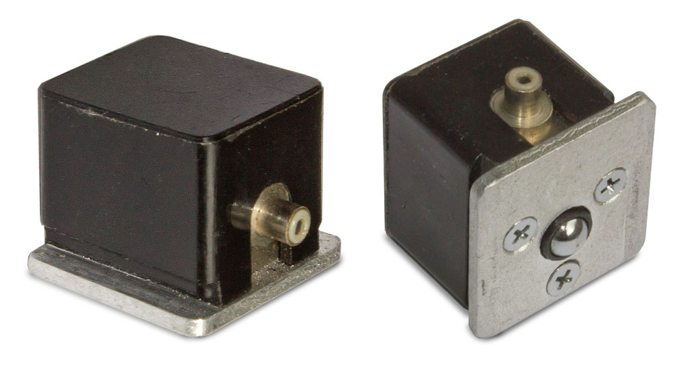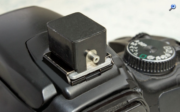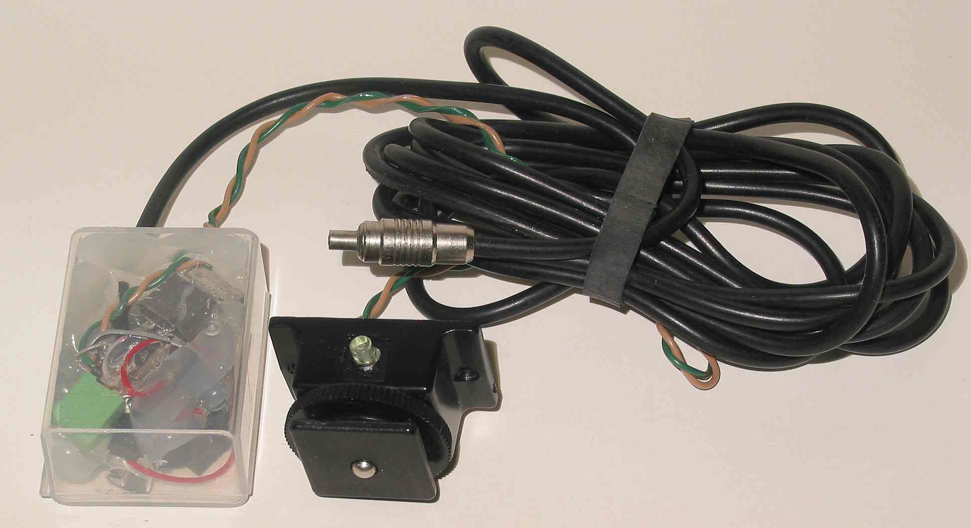 Ein Adapter vom Sucherschuh-Kontakt zu einem externen Blitzgerät mit Koax-Anschluß. Fabrikat 'Heinztronic', ca. 2009. Im Gegensatz (wahrscheinlich) zum Hameg-Adapter gibt es hier einen eingebauten Thyristor zum Zünden. Dadurch ist es möglich, auch Uralt-Blitzgeräte wie mein Braun-Hobby an eine moderne Kamera anzuschließen. Die hohen Zündspannungen alter Blitzgeräte würden andernfalls die Elektronik moderner Kameras zerstören.