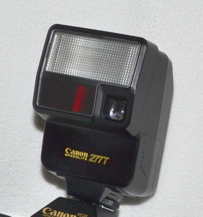 Für die ab 1983 angebotenen Fotoapparate der T Serie (T50, T 70, T80 und T90) entwickelte die Firma Canon auch neue Blitzgeräte die für eine problemlose Blitzautomatik sorgten. Hier nun einige Worte zum mittleren Gerät: Dem Speedlite 277 T Im Gegensatz zum 244 T kann dieser Blitz problemlos im manuellen Betrieb verwendet werden. Durch die Blendenvorwahl in acht Stufen wird die Blitzleistung angepasst. Die Automatikfunktion ist durch die achtstufige Blendenvorwahl und eine vorsetzbare Weitwinkel-Streuscheibe ebenfalls erweitert. Die ISO Vorwahl reicht von 25 bis 400. Wie beim 244 T zündet beim Antippen des Auslösers ein Infrarot-Vorblitz mit dem eine geeignete Blendenzahl bestimmt und an die Kamera übertragen wird. Dafür stehen die Blendenzahlen 2; 2,8; 4; 5,6; 8; 11; 16 und 22 zur Verfügung. Bei nicht ausreichender Blitzleistung (zu grosse Entfernung) leuchten je nach Kameramodell unterschiedliche Warnsignale im Sucher auf.