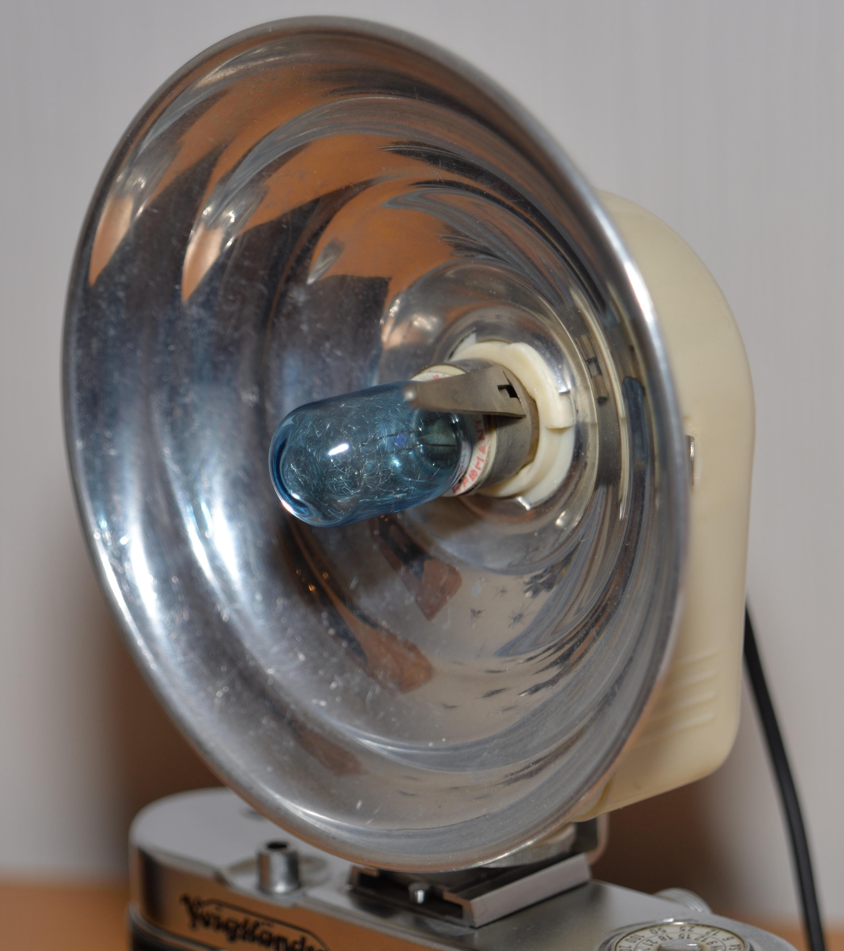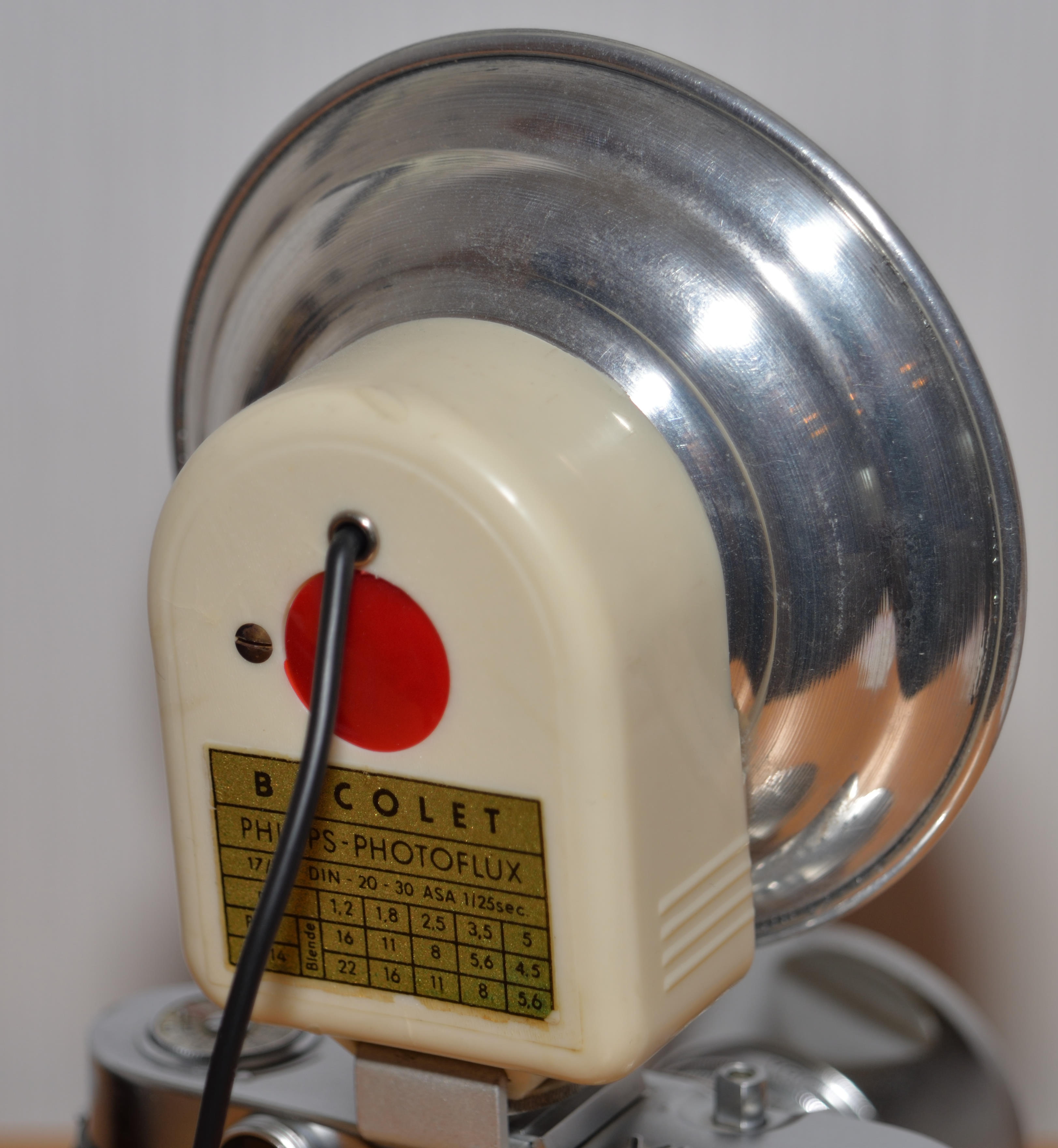 Hier die Bacolet-Blitzleuchte "Made in Germany". Über den Hersteller ist mir nichts bekannt, es handelt sich aber um ein durchaus wertig verarbeitetes Blitzgerät aus den frühen 1950er Jahren. Der Reflektor ist über einen Bajonettverschluß abnehmbar. Es können Blitzlampen mit Bajonett BA15s verwendet werden, ein Adapter für PF- oder XM Birnen liegt bei. Batterie: 22,5 Volt. Auf der Rückseite ist eine BlendenTabelle für Philips Blitzbirnchen. Keine Prüflampe.
