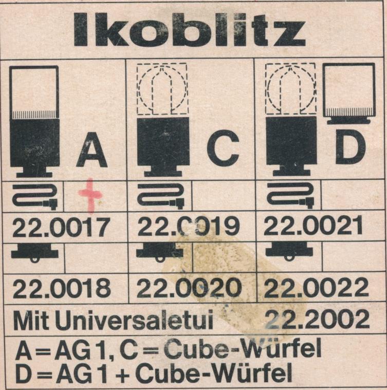 Hallo zusammen. Als bei Zeiss-Ikon/Voigtländer anfangs der 1970er Jahre langsam die Lichter ausgingen, hatte man dennoch ein Blitzgerät im Programm. Schlicht "Ikoblitz" genannt, war es wahrscheinlich ein Zukaufteil das aber immerhin in 6 Ausführungen angeboten wurde.