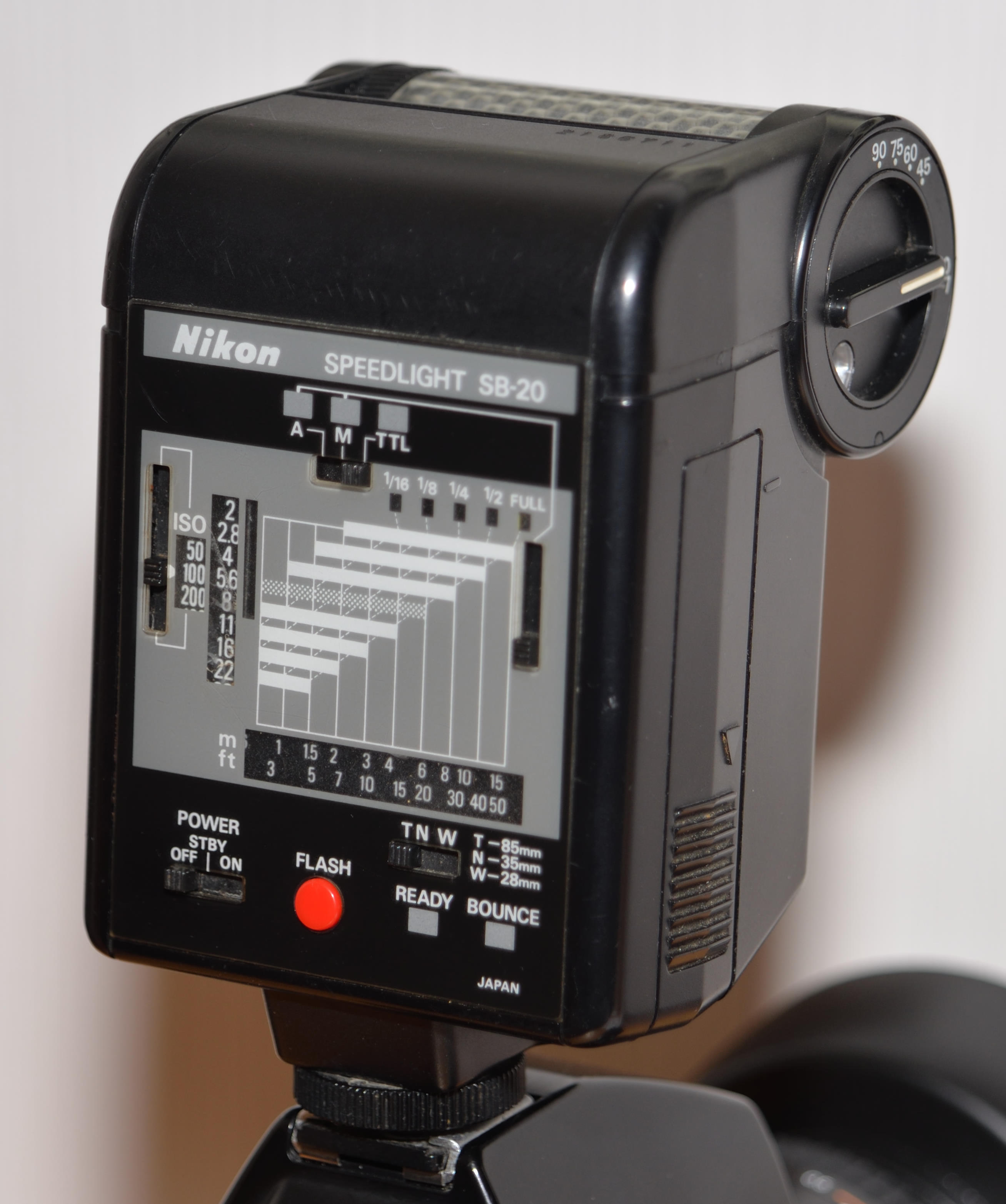 Der SB 20 ist der erste Systemblitz für die Nikon F der ein AF-Hilfslicht bietet. Gerade wenn es dunkel ist, freuen sich ältere (und auch neuere) AF-Syteme über die roten Streifen die auf das zu fotografierende Objekt projeziert werden. Ansonsten erfreut der Blitz mit einer hübschen Optik durch den runden Reflektor und einer in den meisten Fällen ausreichenden Leistung. Der reflektor ist durch Drehung in 5 Positionen schwnkbar, Die Streuscheibe hat drei verschiedene Riffelungen für (T)ele, (N)ormal und (W)eitwinkel. Leitzahl 30 bei 100 ISO. 4X AA Batterien werden benötigt.