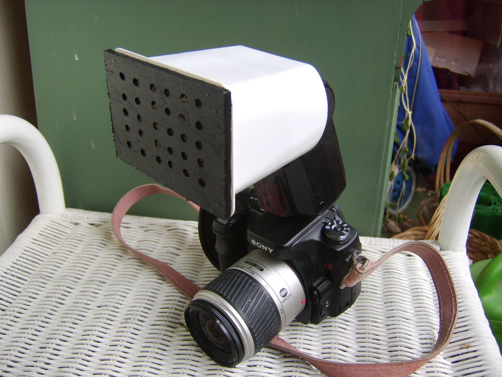 Vor der kleinen Blitzfläche kamen ungefähr 18 Löcher in 3 Reihen zum Einsatz. Ich musste dann mit der Blende und den ASA-Werten experimentieren. Es gab noch etwas Hintergrundlicht im Zimmer.