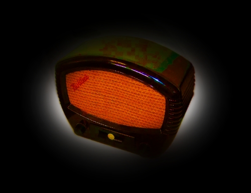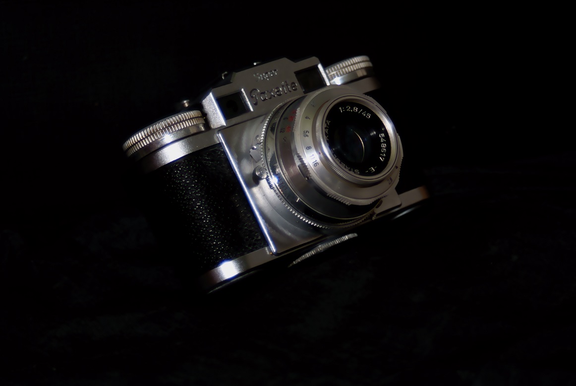 Das Motiv (hier ein altes Radio von ca. 1954) stand auf einer dunkelgrauen Decke. Ich musste mit einer Bildbearbeitung den Helligkeits/Kontrast-Umfang etwas nachjustieren um den großen Randbereich ins Schwarze zu bekommen. Man sieht recht gut die fast ovale Ausleuchtungszone. Ich hatte eher eine Rechteckzone erwartet.