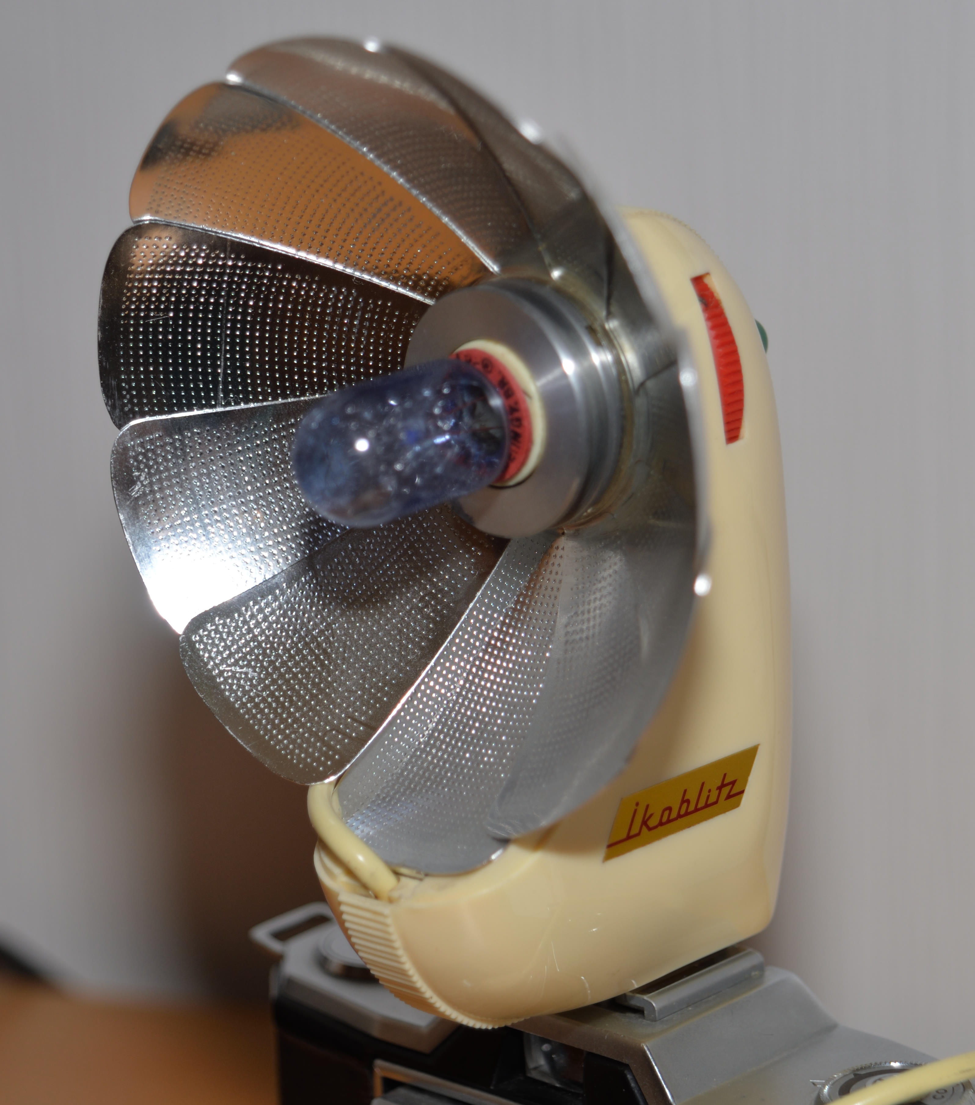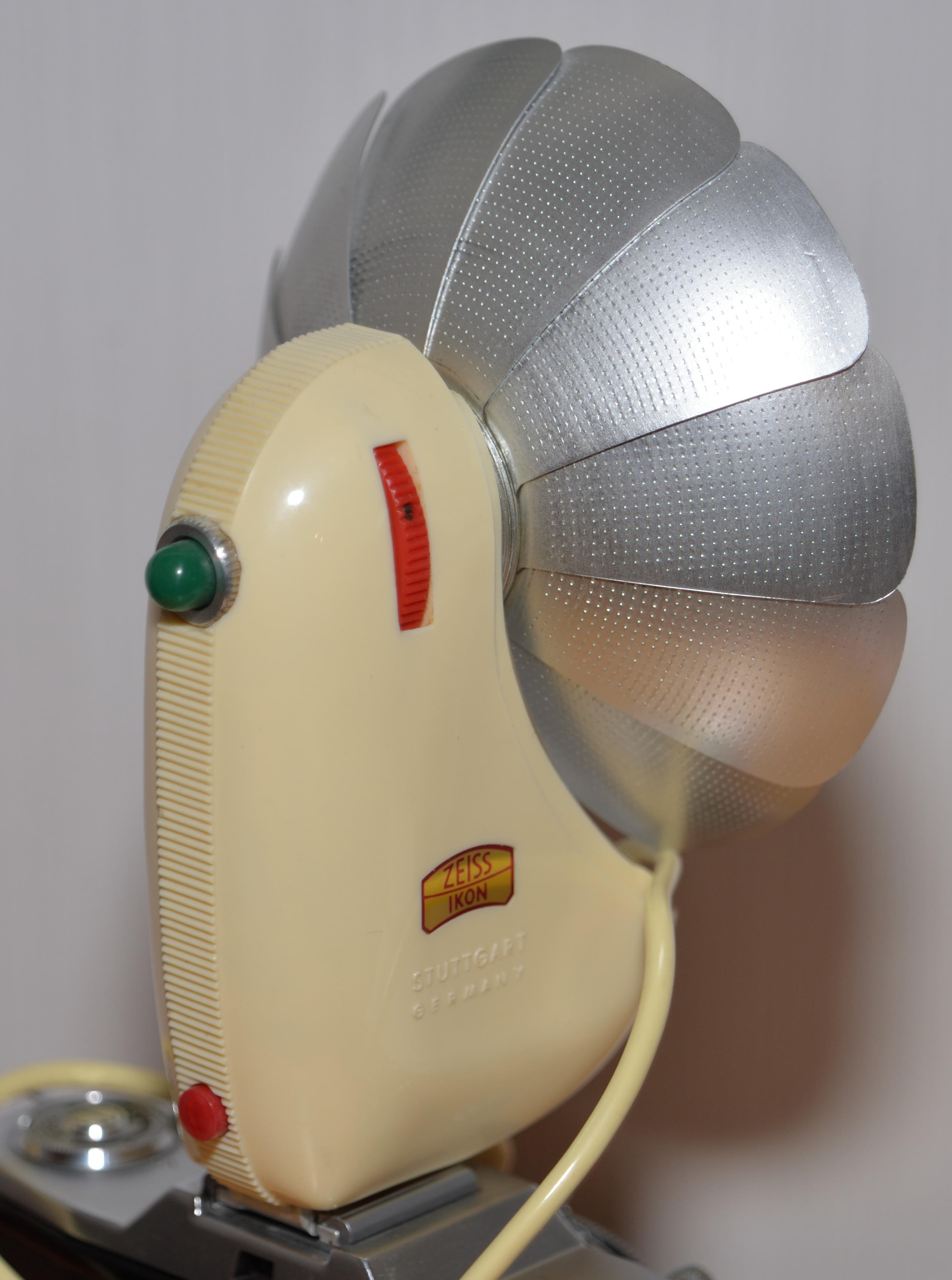 Der faltbare Reflektor (deswegen wurde das Gerät auch unter dem Namen "Folding Ikoblitz" verkauft) wird durch eine Drehung am roten Rändelrad eingefahren, gleichzeitig wird die Blitzlampe (FP, XB) ausgeworfen. Batterieprüflampe und Blitzfußfeststeller sind weitere Austattungsmerkmale.