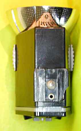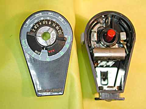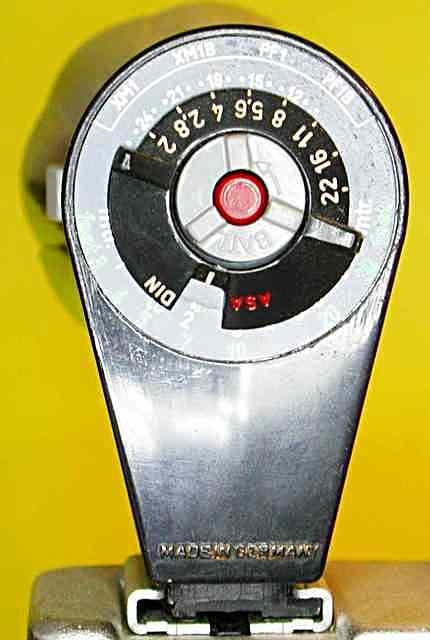 Auf der Rückseite ist der Blendenrechner. Zur Erinnerung sind die Blitzbirnchen aufgeführt: XM1, XM1B, PF1, PF1B. Der rote Knopf in der Mitte dient zum Herausschubsen der verbrauchten Blitzbirne.