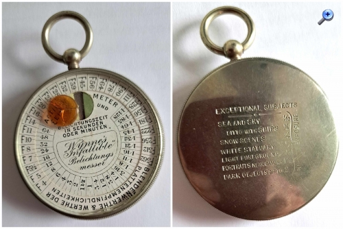 irifue:hier ein Bildbeitrag eines chemischen Belichtungsmessers in Form einer Taschenuhr. Ich habe davon keine Ahnung und weiß nur, dass ein lichtempfindliches Papier eingelegt werden muss und die Zeit, die es zum Verfärben benötigt, gestoppt wird. Dies ist dann die Belichtungszeit.