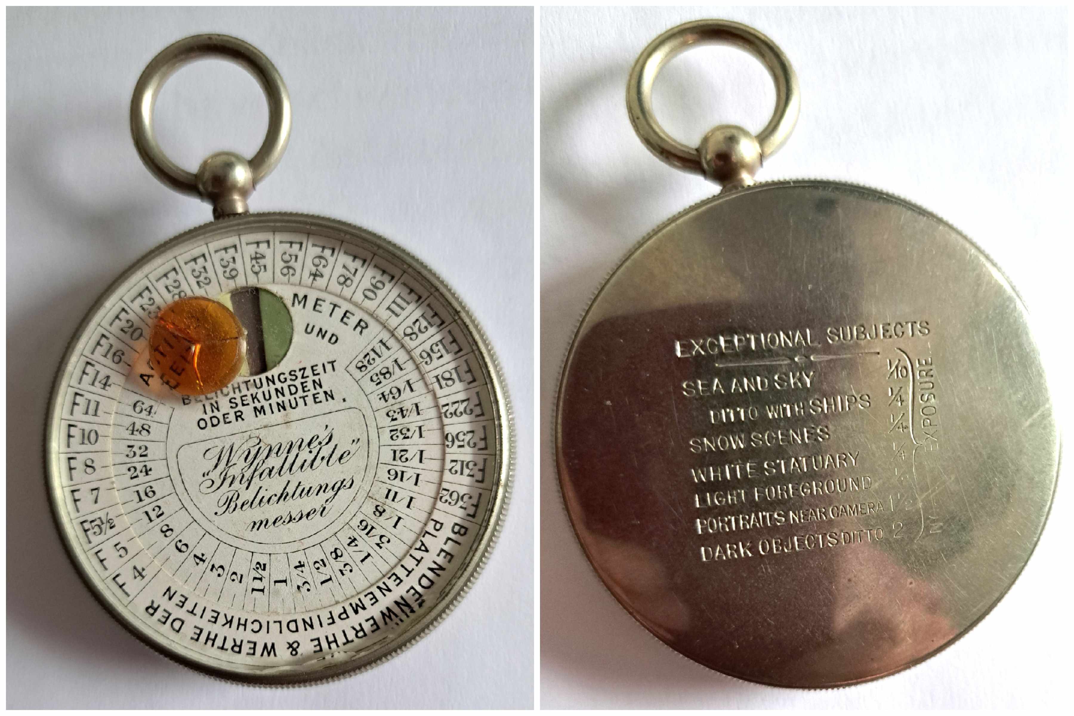 hier ein Bildbeitrag eines chemischen Belichtungsmessers in Form einer Taschenuhr. Ich habe davon keine Ahnung und weiß nur, dass ein lichtempfindliches Papier eingelegt werden muss und die Zeit, die es zum Verfärben benötigt, gestoppt wird. Dies ist dann die Belichtungszeit.