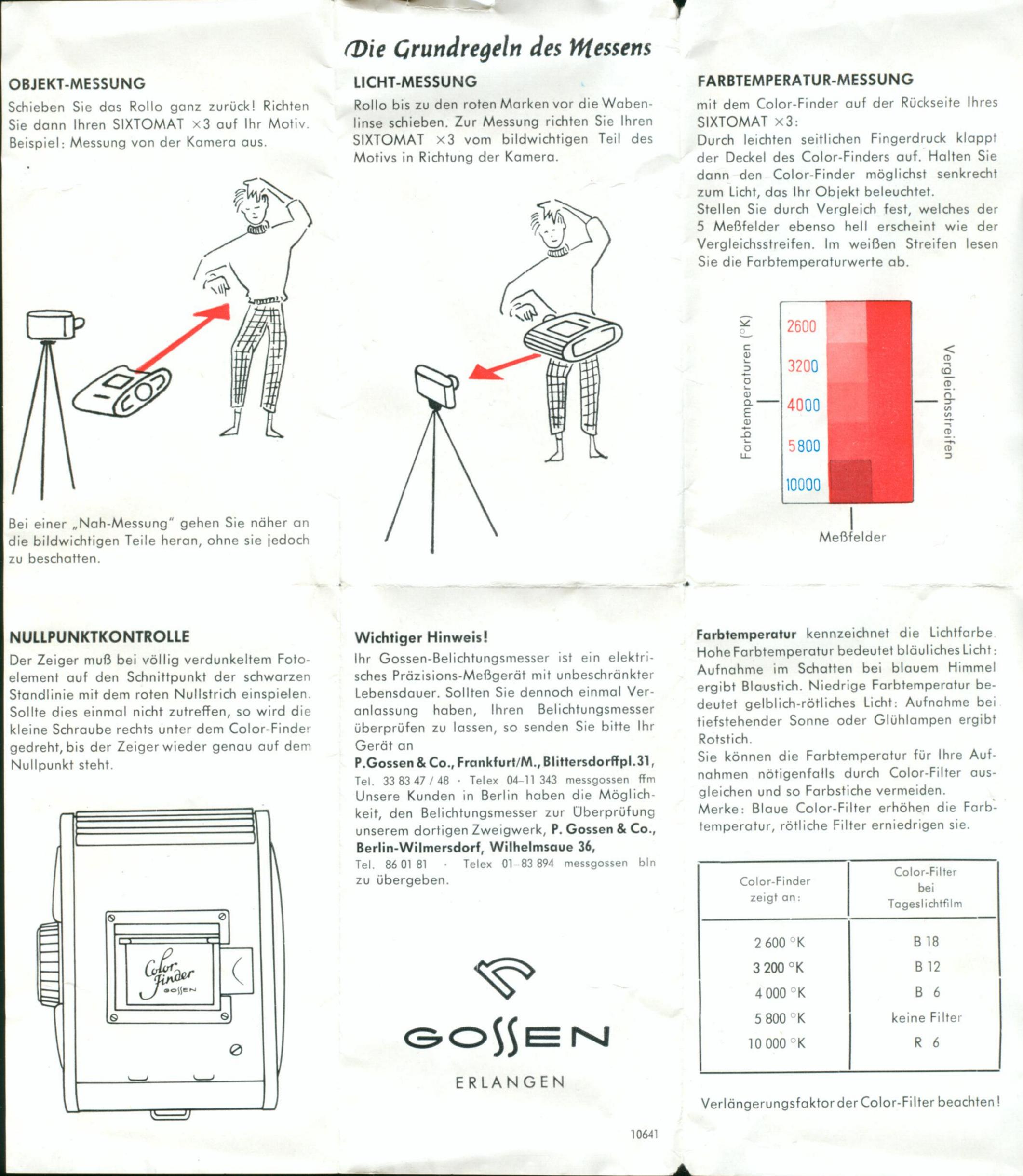 Messvorgang: Der angezeigte Messwert 1-12 wurde auf die drehbare Anzeigewalze übertragen und die gemessene Zeit-Blendenkombination konnte abgelesen werden. Die Blendenwerte für Filmkameras wurden direkt über der Ganggeschwindigkeit angezeigt. Ab 1954 wurde das Gerät mit einem aufklappbaren "Colorfinder" auf der linken Geräteseite ausgeliefert. Verschiedene rote Farbfelder ermöglichten die Ermittlung der Farbtemperatur über ein Referenzfeld.