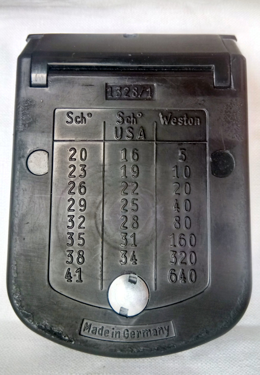 ich denke auch dass dieses spezielle Modell für den Export nach USA gedacht war, immerhin sind 3 damals in USA gebräuchliche Systeme angegeben (ASA, Weston und Scheiner-USA). Es gab sie wohl auch mit Scheiner und DIN auf dem Einstellrad.