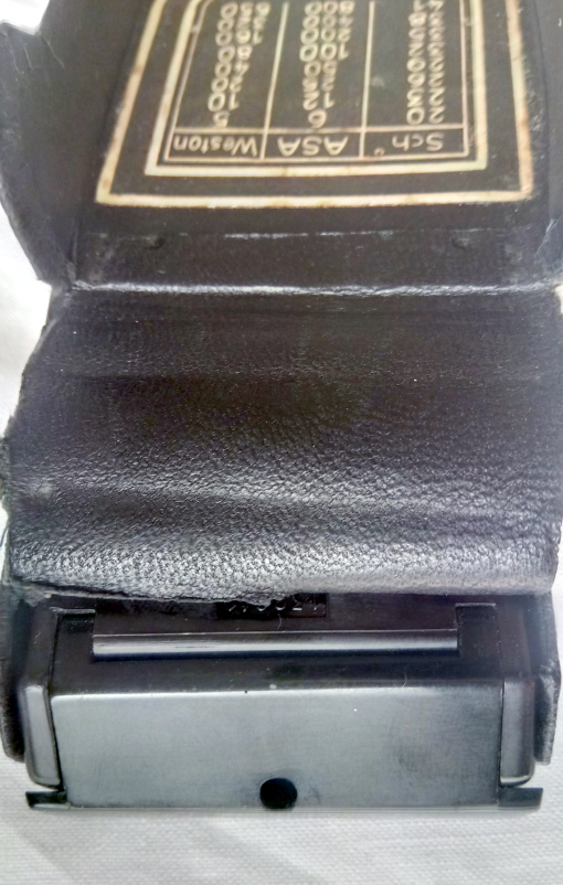 Umrechnungstabelle Scheiner Grade, ASA und Weston auf der Innenseite/Deckel der Schutzhülle und Scheiner Grade, Scheiner Grade-USA und Weston auf der Unterseite des Belichtungsmessers.