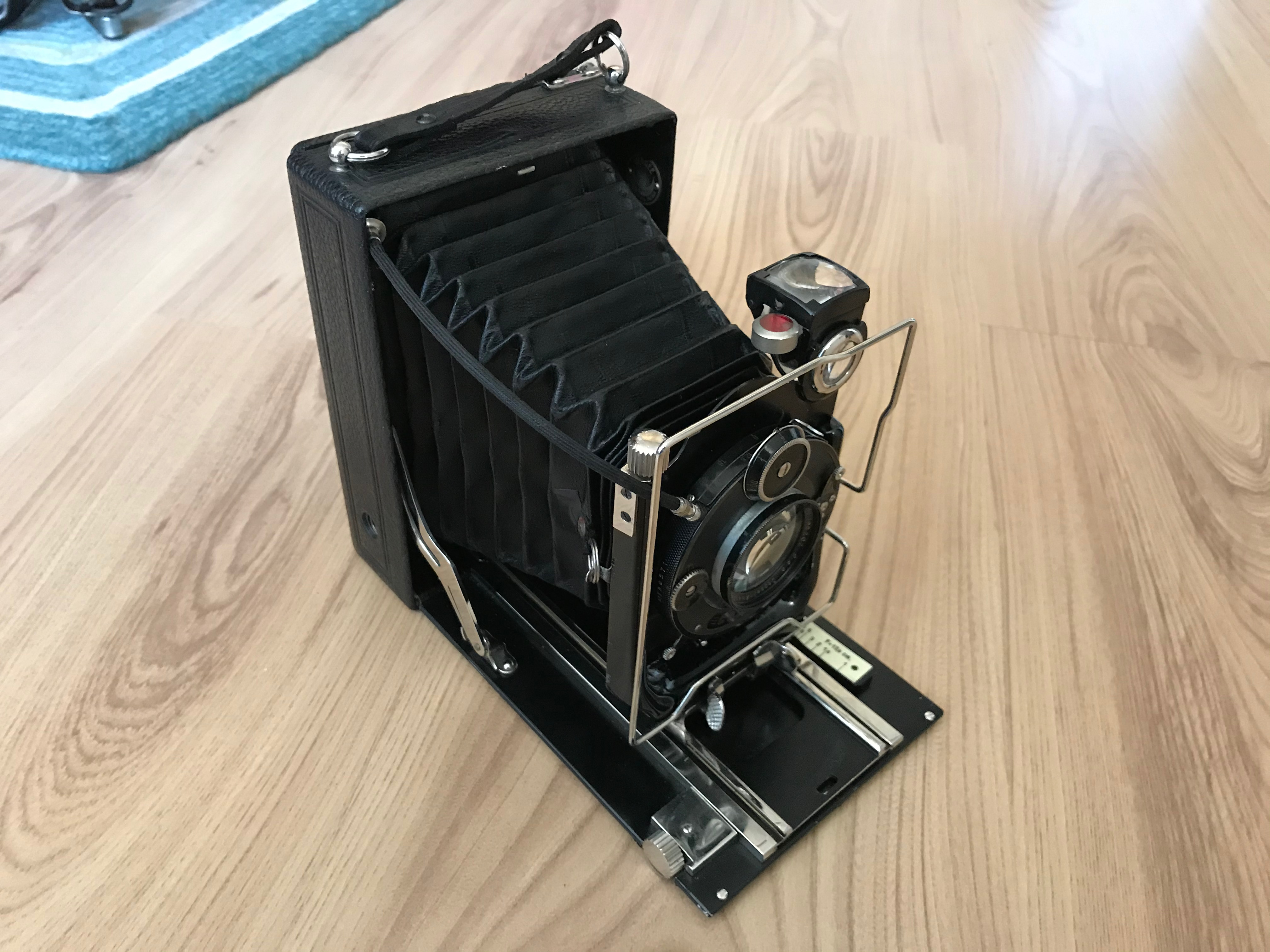 Das ist eine Frankenstein Kamera mit 9x12 Ihagee Gehäuse und dem Compurverschluss einer 9x12 ICA. Bei der Ihagee war das Gehäuse top und alles war in einer schönen Ledertasche verstaut zusammen mit den Filmhaltern, aber dafür im Verschluss die Feder gerissen und die Linsen waren stark Pilzbefallen. Bei der Ica war es genau anders herum. Kein Zubehör, das Gehäuse sehr schlecht, dafür die Optik gut und der Verschluss in Ordnung, da nicht verklebt und so gut zu reinigen. Sogar die langen Verschlusszeiten laufen noch ganz passable.
