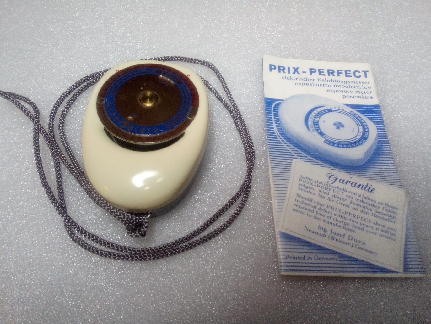 Hallo Andreas ich habe mal meinen Perfect Belichtungsmesser genauer angesehen. Das es die Kordelausführung ist war mir klar da in der Polystyroldose kein Platz für das Lederetui ist, aber auch meiner hat auf der Rückseite dieses überflüssige Loch ohne Gewinde, ich könnte mir vorstellen das es nur ein Spritzguss Werkzeug gab und erst bei Bedarf das Gewinde eingeschnitten wurde. Die Fotos von Photobutmore stammen wahrscheinlich aus einem anderen Fertigungszeitraum da sowohl deiner und auch meiner hinten beschriftet ist die Fotos aber eine unbeschriftete Rückseite zeigen.