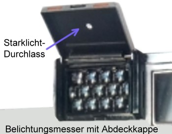 Schutzklappe mit Lichtminderung: Einige Kameras haben in der Klappe Schlitze oder Löcher. Im zugeklappten Zustand wird nur wenig Licht zur Selen-Zelle durchgelassen. Das reichte für Standard-Lichtverhältnisse. Bei Situationen mit wenig Licht, wurde die Klappe geöffnet um die Anzeige entsprechend zu verbessern.