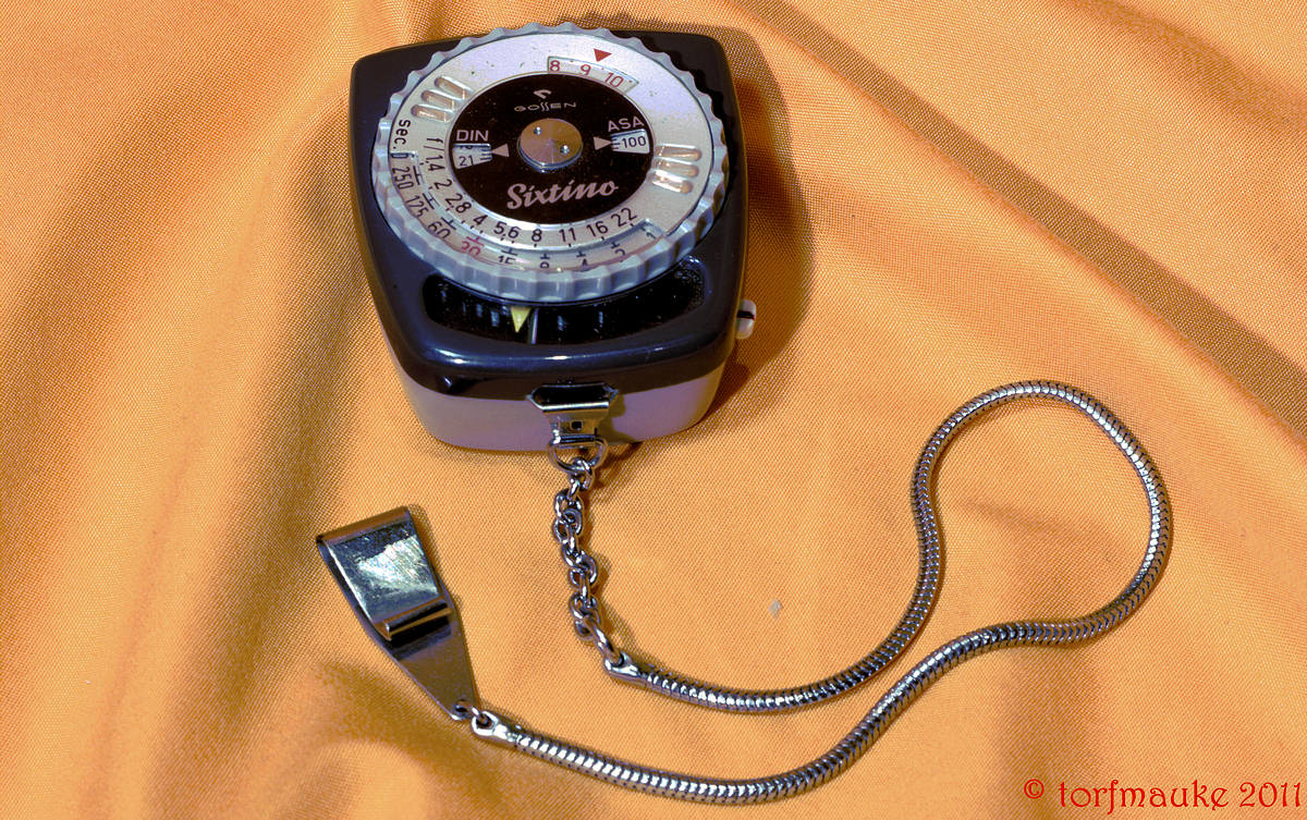 Der Gossen Sixtino war ein relativ kleiner Belichtungsmesser, den man mit der Kette und dem Clip sicher befestigt in der Hosentasche tragen konnte. Auch er zeigt die Werte noch einigermaßen genau an. Der Clip passt wunderbar in Knopflöcher oder auf Trageriemen und verhinderte so wirkungsvoll den Verlust und Beschädigung durch Herunterfallen.