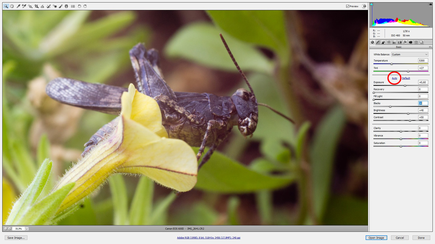 In Photoshop CS5 geöffnet und den "auto" Button gedrückt sieht das Bild schon ganz gut aus.