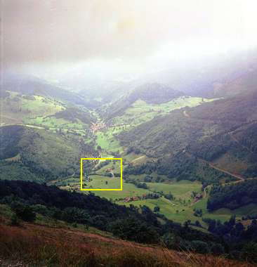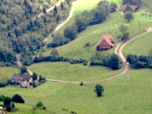 Bei meiner Scan-Aktion wurde ich misstrauisch, ob vielleicht mein Scanner falsch eingestellt ist. Klar, die Mittelformat-Fotos aus 60 Jahren reichten von der 4x4 Plastik-Kamera von Quelle für fünf Mark über die Lubitel bis zur Hasselblad mit Planar. Die schärfsten Fotos meines Lebens, das beste Filmformat (6x6 Mittelformat, nicht Kleinbild) mit meiner schärfsten herkömmlichen Kamera (einer Yashicamat 124G, und meine Entschuldigung an die Firma Zeiss, Hersteller des Planars), sahen mir plötzlich nach dem Einscannen gar nicht so dolle aus. Überprüfung und Vergleich des Negativs mit Hilfe einer 20fachen botanischen Lupe: Der Scan ist prima, wir sind nur durch die digitalen Spiegelreflexkameras und die für sie konstruierten Hochleistungsobjektive verwöhnt. Bei einem Scan @1600 dpi (dots-per-inch entsprechend 63 Linien pro Millimeter) mit 2400x2400 Pixel = 5,8 Megapixel vom Filmbild 60x60 Millimeter sind erfahrungsgemäß alle Einzelheiten damaliger Amateur-Farbfilme zu sehen. Mehr Auflösung (der Scanner kann viermal so viel) einzustellen brachte keinen Vorteil. Hier ein Gesamtbild, Aussicht vom Belchen in Richtung Schweiz, und einen Ausschnitt mit der maximalen Schärfe, die so ein Farbnegativfilm der 70er Jahre hatte: