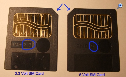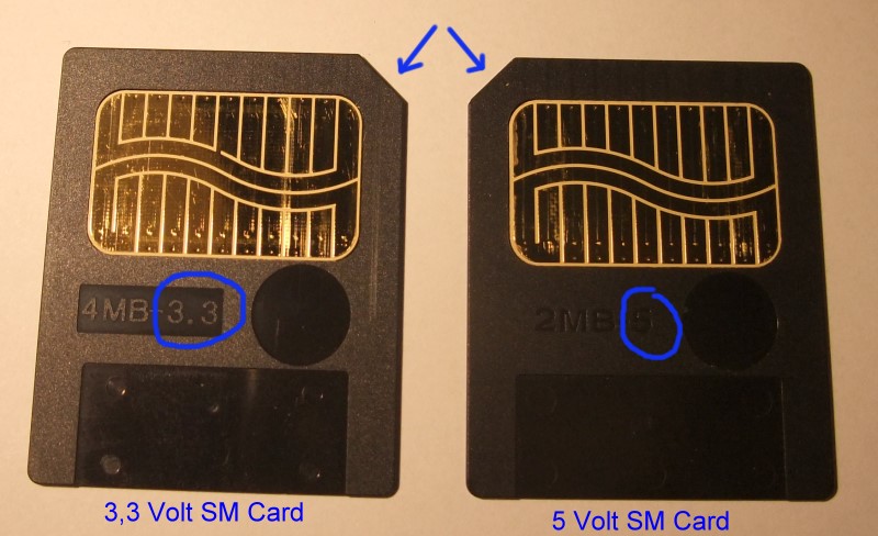 Hinweis: Vom Äußeren sind die Smart Media Typen 3.3 und 5 Volt gleich, bis auf die kleine Abschneidung am Rand. Die sind bei beiden Typen spiegelverkehrt.