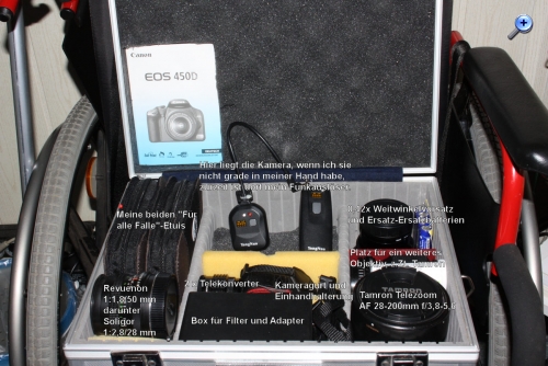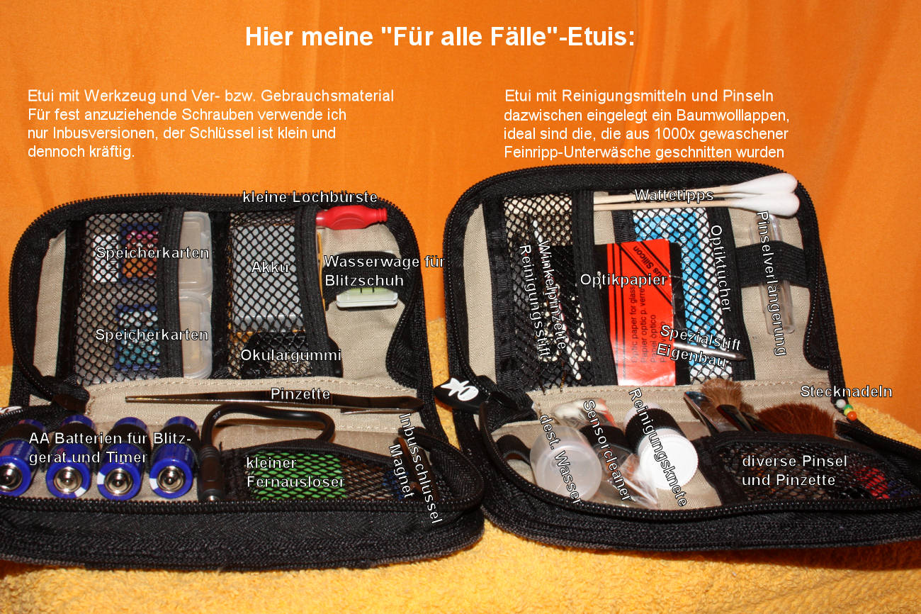 Neben der für's Fotografieren wichtigen Ausrüstung, die ich, Stative und Makroausrüstung ausgenommen, in meinem Alukoffer aufbewahre und meistens auch dabei habe, wenn ich auf Jagd gehe, sind zwei Etuis für mich wichtig, die ich gerne als "Für alle Fälle"-Etuis bezeichne. Auch sie haben ihren festen Platz im Koffer.