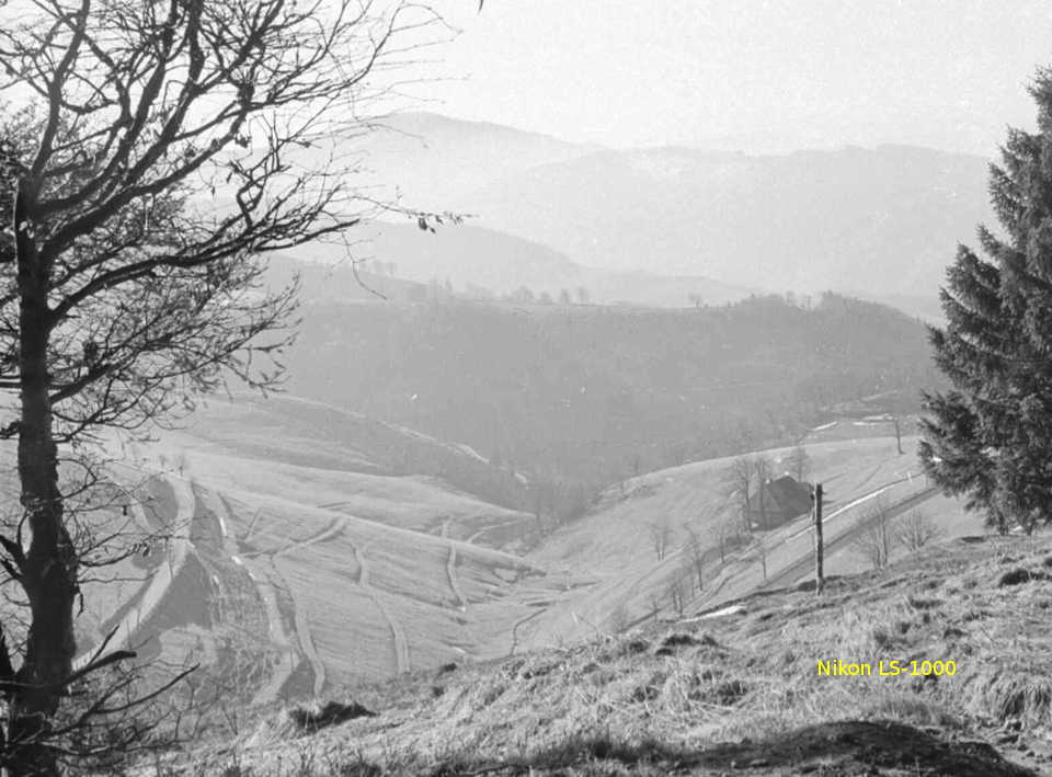 So kann ich Euch meinen kleinen adhoc-Vergleich vorstellen, aufgenommen am 4.2.1966 mit einer Exa I, Trioplan 50mm, bei Blende 22, 1/2 Sekunde, Stativaufnahme auf fein entwickeltem Adox 14-DIN-Film vom Schauinsland (Südbaden) ca. in Richtung Todtnau: