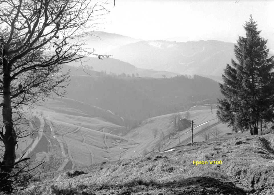 Mein persönliches Fazit? Der Epson V700 ist dem renommierten Nikon Filmscanner so wenig unterlegen, daß man den Unterschied mit bloßem Auge nicht erkennt. Da ich den Kontrast von Hand nach Gutdünken anpasse, machen in der Praxis die Bilder aus dem Epson V700 bisweilen sogar einen schärferen Eindruck und auch die Durchzeichnung der Schatten und Lichter ist eher von der Sorgfalt in der Nachbearbeitung abhängig als von der etwas besseren Dmax des Nikon. Der Wald links oben im kleinen Bild lässt bei Nikon mehr Äste erkennen.