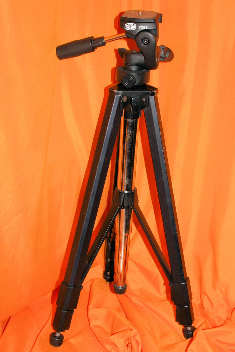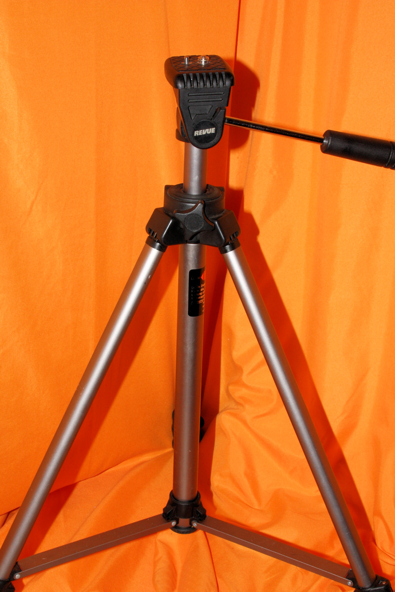 Die gezeigten Geräte sind sehr nützlich, um Kameras und Lichtquellen zu befestigen und auszurichten. Das sehr stabile Stativ habe ich mir auch in der Bucht ersteigert. Es besteht aus starken Alu-Profilen und ist deswegen zwar nicht grade leicht, hat aber dafür schon fast Holzstativ-Qualitäten. Ausserdem kann man die Mittelsäule herausnehmen und als Einbeinstativ verwenden. Den Neiger habe ich mir neu gekauft, er ist ebenfalls stabil und mit einer Schnellwechselplatte versehen.