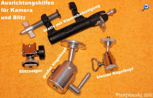 Auf diesem Foto sieht man weitere nützliche Hilfsmittel. Das Klemmstativ lässt sich vielseitig befestigen. Ob Ast oder Rohr, Tischplatte oder Zaun, es gibt viele Möglichkeiten. Die Kugelköpfe sind optimal für Stative, um Kameras oder Lichtquellen blitzschnell auszurichten. Den großen Kugelkopf zum Beispiel verwende ich auf meinem Elektroscooter, der mit seinem Gewicht dadurch zum fahrbaren Stativ wird. Mit dem Blitzneiger kann man Blitzgeräte ohne Reflektorverstellung dennoch fürs indirekte Blitzen nutzen.