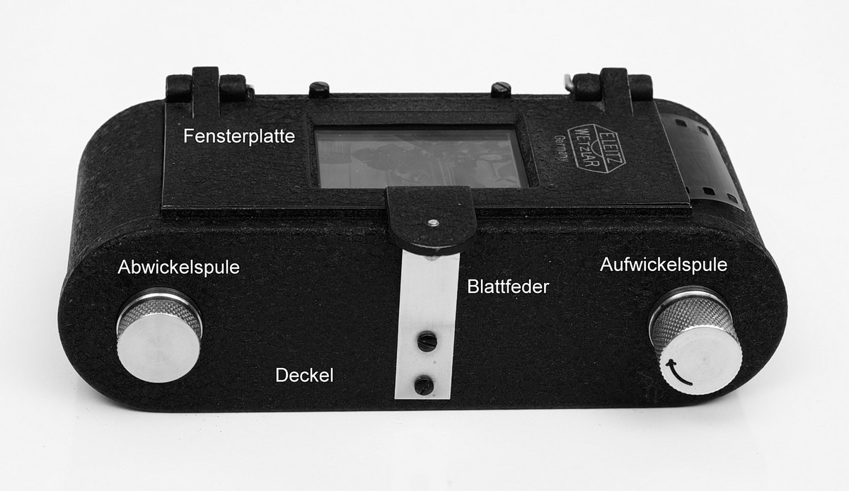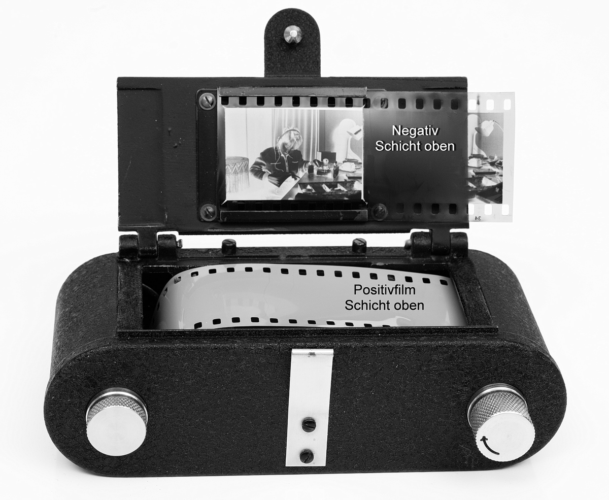 mit dem hier gezeigten Leitz Kopiergerät ELDIA konnte man Diapositiv-Bildbänder nach Schwarz-Weiß-Negativen im Format 24x36 mm oder 18x24 mm herstellen. (Für das Halbformat brauchte man eine andere Fensterplatte.) Negativ und Positiv-Film werden Schicht auf Schicht aufeinander gedrückt. Die Belichtung durch das Negativ konnte mit einer mattierten Glühlampe mit Schaltuhr aus ca. 1 m Entfernung erfolgen. Belichtungsmesser gab es nicht, es zählte die Erfahrung. Gleiches gilt für die Entwicklung des Positiv-Films in Papierentwickler bei roter Beleuchtung.