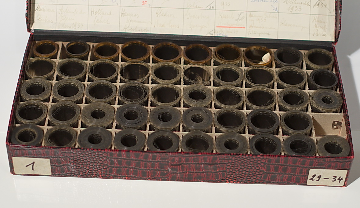die s/w-Negative meines Vaters und von mir (bis 1974) liegen als Positive auf Filmstreifen vor. Kleinstbildnegative haben wir mit dem Vergrößerer auf Filmstreifen vergrößert. Von den Bildern vor 1945 existieren nur die seinerzeit zum Glück ausgelagerten Positive. Übrigens befinden sich in den Schachteln auch viele unzerschnittene Farbdiafilme.
