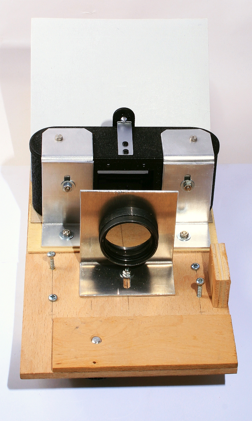 Die Kamera (hier nicht mit im Bild) wird im vorderen Teil mit der Stativschraube fixiert. Der weiße Karton im Hintergrund dient als Reflektor für das Licht einer Tischlampe. Da ich nur SW-Negative digitalisiere, ist das Spektrum der Lichtquelle von untergeordneter Bedeutung. Der Vorteil dieser Anordnung: durch die beiden Planglasplatten zwischen denen das Negativ im ELDIA gehalten wird bekommt man eine einwandfreie Planlage. Wichtig wg. der geringen Schärfentiefe. Schon mit einer älteren (aber guten) 4-Megapixel-Kamera bekomme ich eine für meine Zwecke mehr als ausreichende Auflösung. s.a. https://blende-und-zeit.sirutor-und-comp...amp;thread=15#3