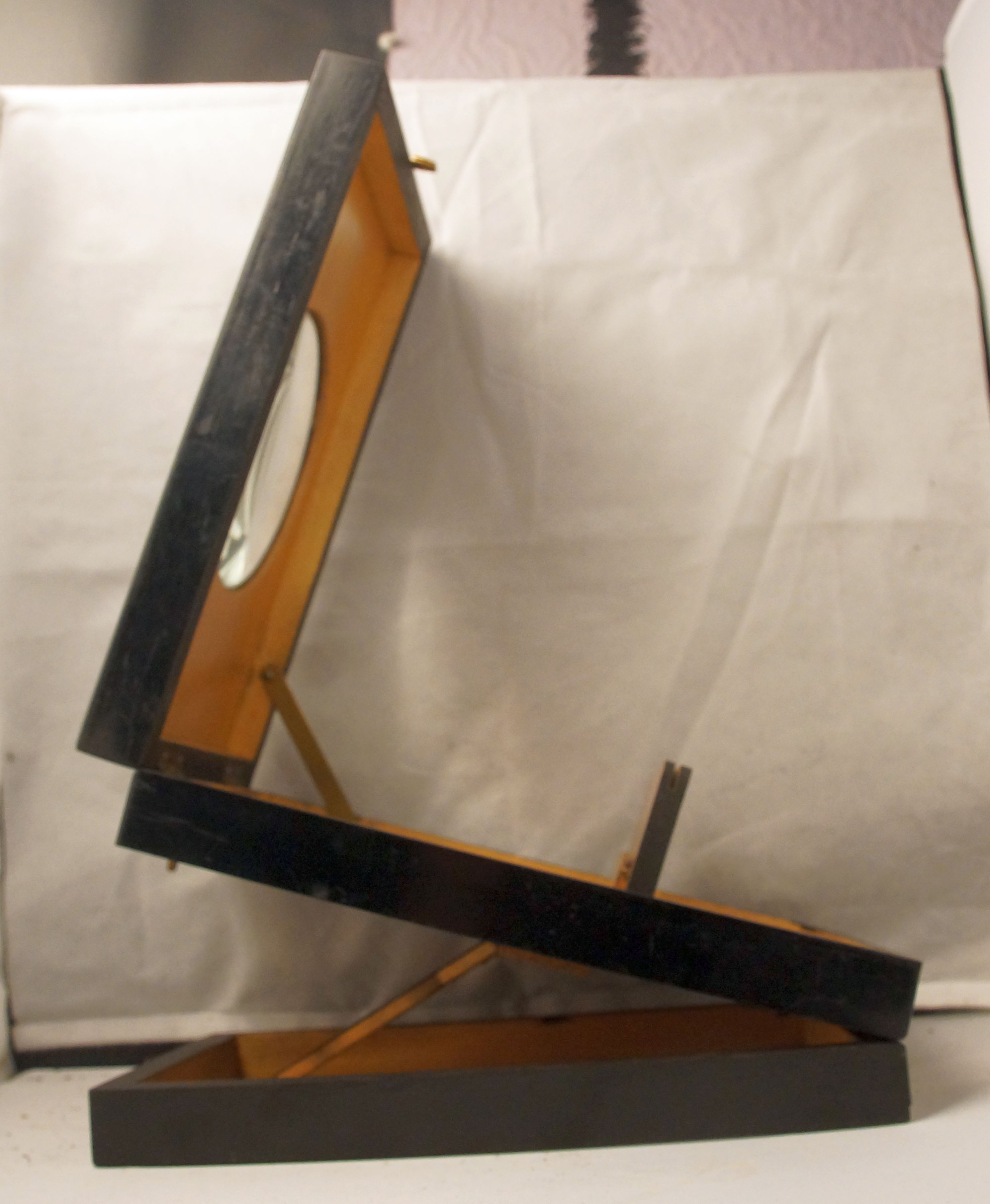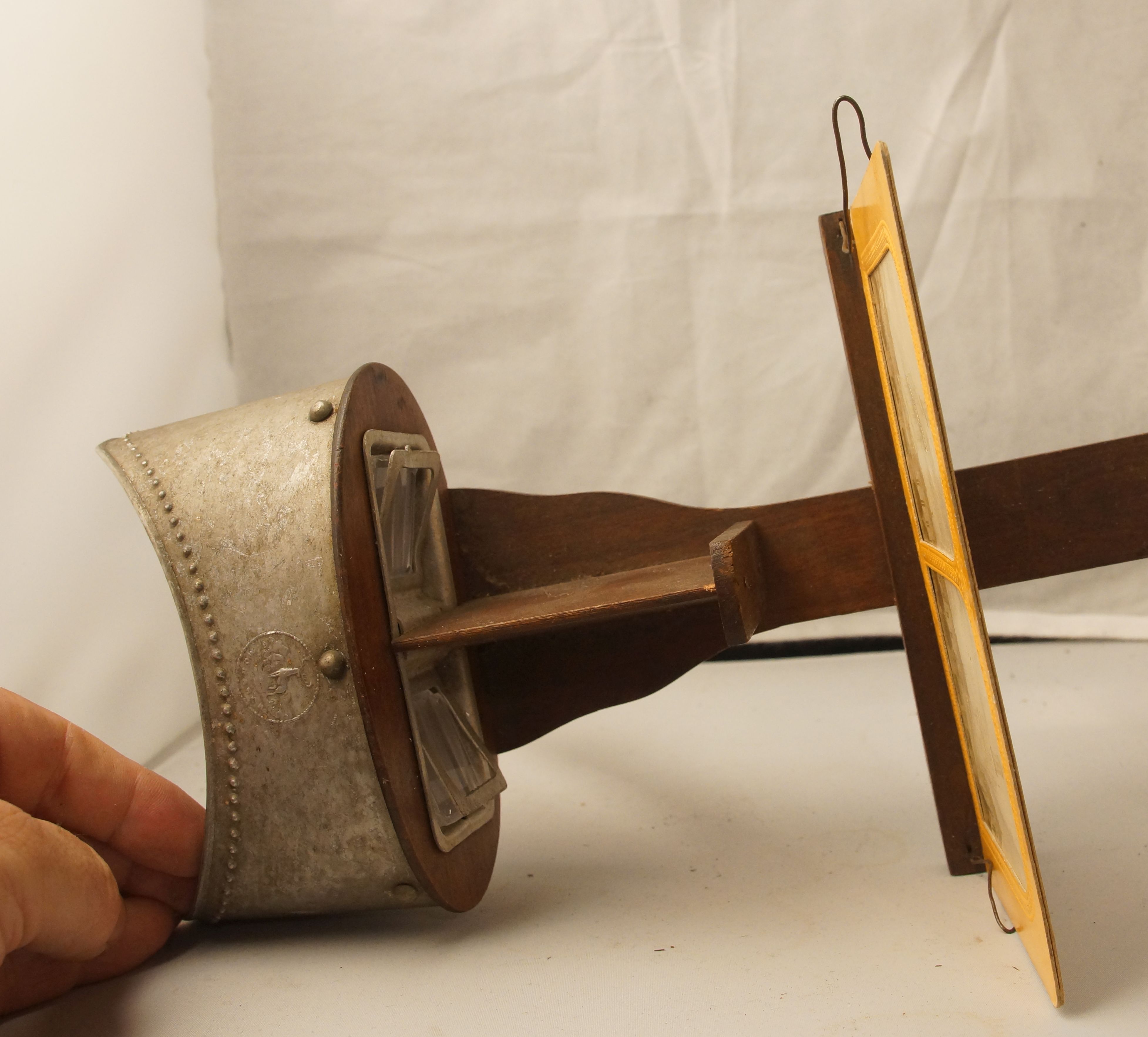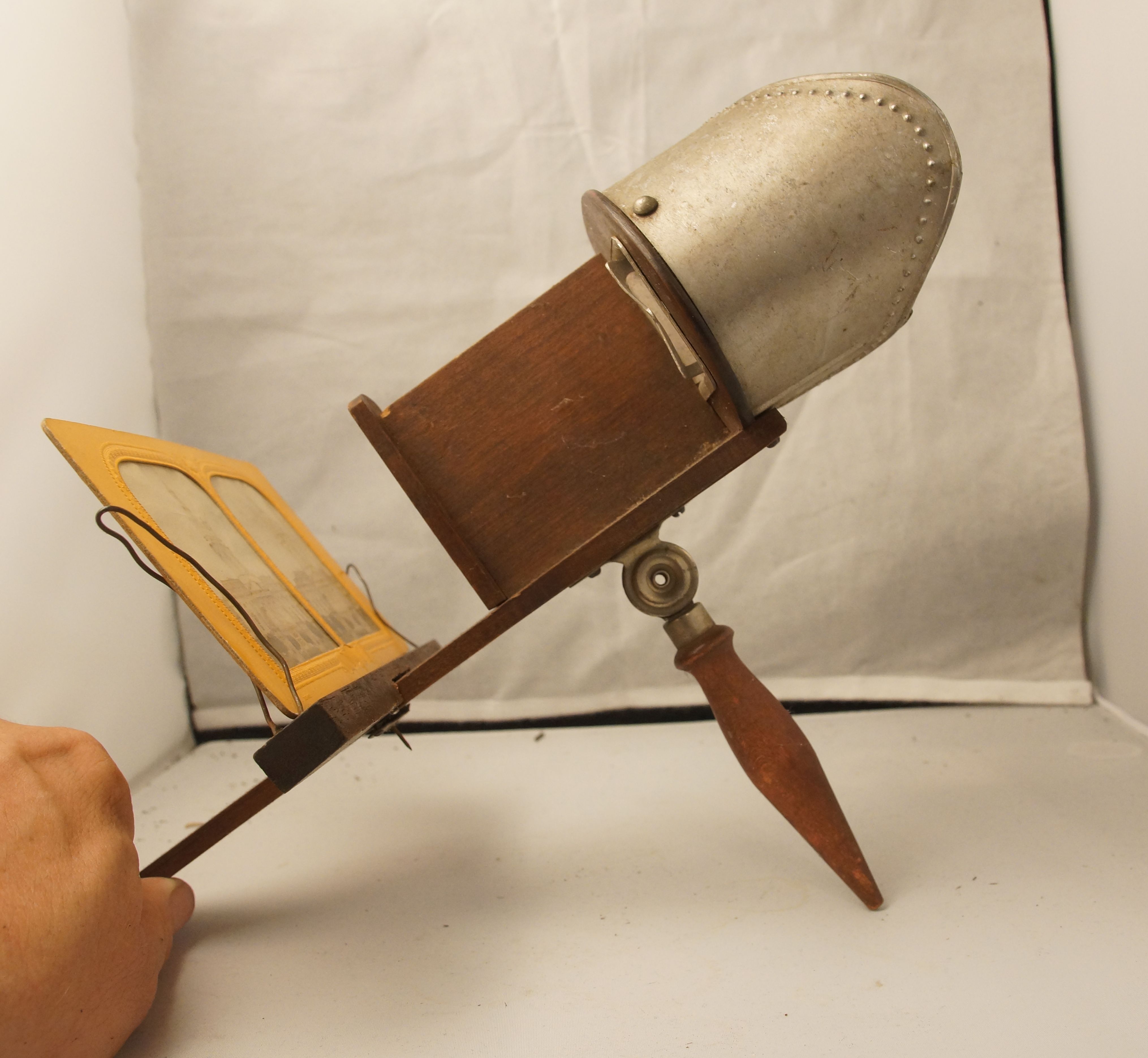 Hallo, in letzter Zeit hatte ich etwas Glück beim ersteigern, zum Teil weil Artikel falsch eingestellt, und zum Teil weil Beschreibung und Bilder eher schlecht waren, so kam ich an etliche Negative Stereobilder und eben auch Bildbetrachter, die wie ich finde unbedingt Teil der Photographica sind. Leider kann man zu Herstellern nicht viel sagen, da nur einer eine Herstellermarkierung hat. Den Herstellungszeitraum würde ich etwa um 1900 oder früher ansetzen. So nun zum ersten, wurde als Stereobetrachter angeboten, ist meiner Meinung nach aber für einzelne Bilder gedacht, es gab ähnliche auch für Stereo, aber die hatten unter der großen Linse noch zwei kleine, eben für Stereo.