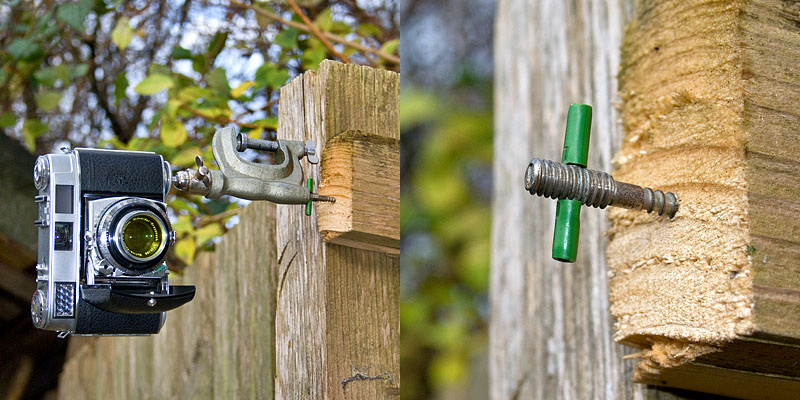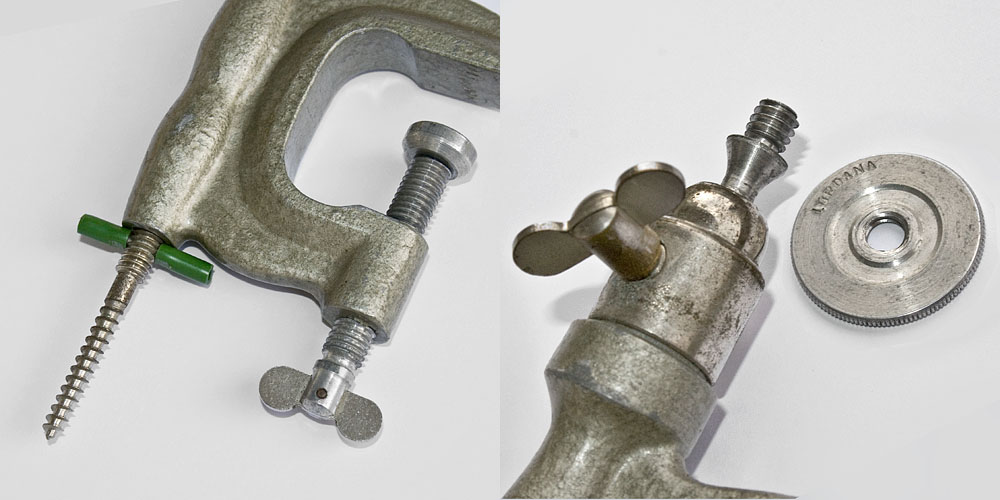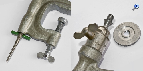 Montage mit der Baumschraube (links). Zum Ausdrehen der Baumschraube kann die Stativklemme verwendet werden (rechts).