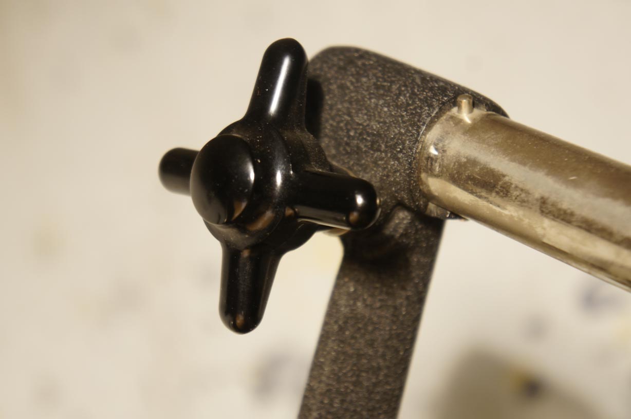 In die Richtung Repro hab ich auch schon gedacht... Die lange verchromte Stange könnte tatsächlich eine Lampenhalterung sein. Man sieht 3 Stellen an denen wohl etwas befestigt war. Eine genau Mittig (als ich das Teil bekommen hab, war die Stange an dieser Stelle fixiert) und zwei stück, jeweils ganz außen (da könnten Lampen dran gewesen sein oder weitere Haltestangen für Lampen). etwas seltsam ist noch der Arm mit dem Stativgewinde. Da sind nämlich ne ganze Menge Details dran die ich mir nicht so recht erklären kann: 1. die beiden Stifte neben dem Stativgewinde. 2. dieser Arm läßt sich in zwei Stellungen aretieren, die genau 90° zueinander liegen 3. das Rädchen zum Drehen des Stativgewindes ist verschiebbar auf der Achse des Gewindes gelagert (Warum???). Ich hänge Fotos an. So entstehen 3 Stellungen: a) Rädchen rechts, Gewinde ausgefahren b) Rädchen links, Gewinde ausgefahren c) Rädchen links, Gewinde versenkt Das Gewinde läßt sich in jeder der beiden Rädchen-Stellungen (rechts und links) mittels Rädchen drehen.