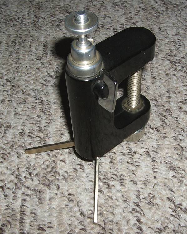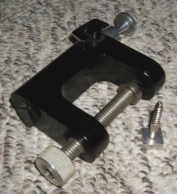 Hallo zusammen, ein (noch?) * unbekanntes Tisch- und Baumstativ. Es scheint aus Kunststoff oder Bakelit zu bestehen und kann sich an Tischplatten klemmen lassen oder mit Hilfe einer Zubehörschraube an einem Baum befestigen lassen. Weiterhin sorgen zwei ausfahrbare Stützen für eine Auftisch-Verwendbarkeit. Ein kleiner Schwenkkopf komplettiert das Stativ.