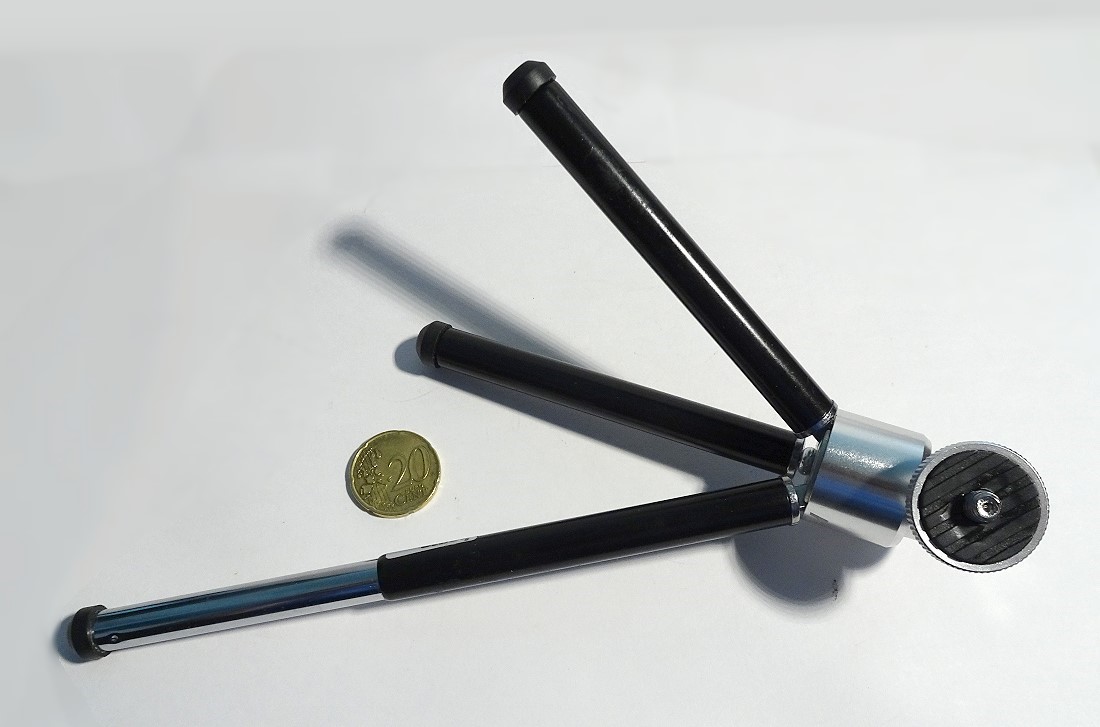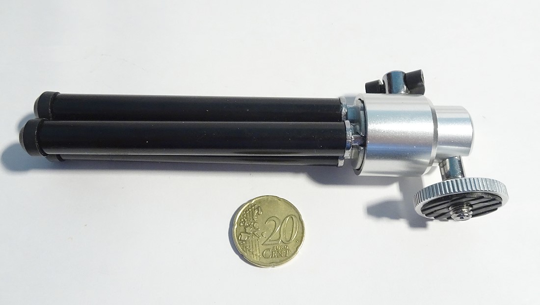 Der Klemm-"Kugel"-Kopf lässt die freie Wahl der Kameralage zu, wenn die Kamera nicht zu schwer ist. Die drei Beine sind als Zwei-Stufen-Teleskop ausgebildet. Ausgezogen ist das Stativ ca 17 cm hoch.