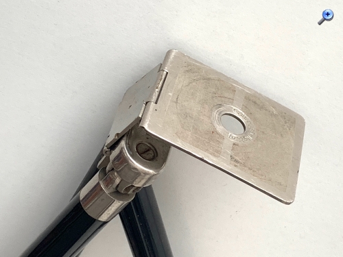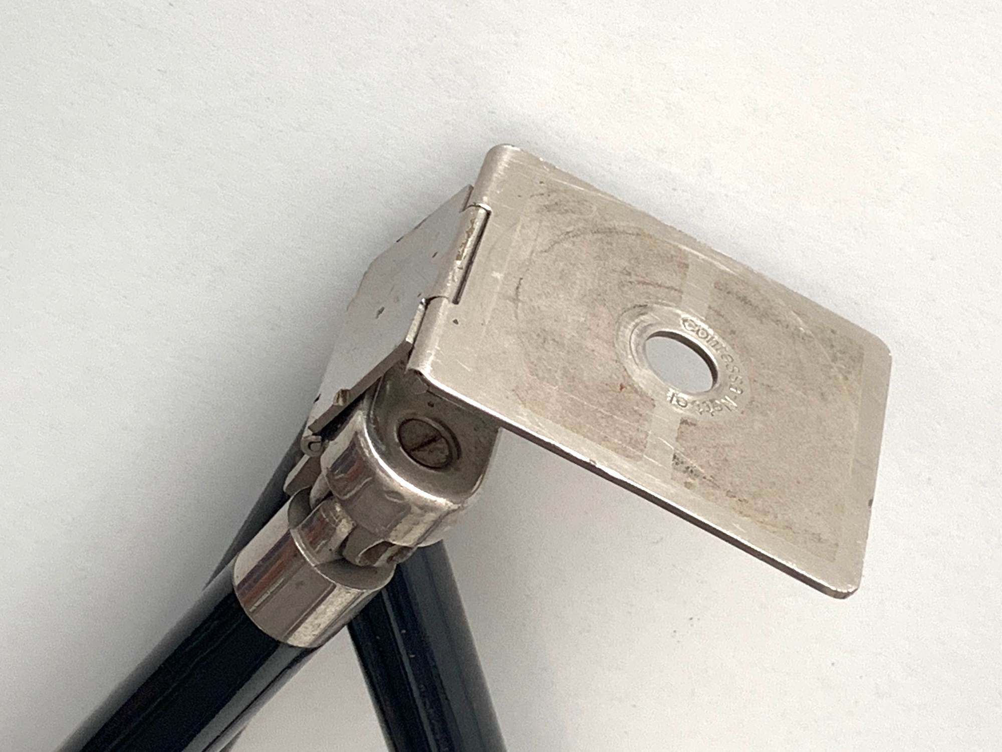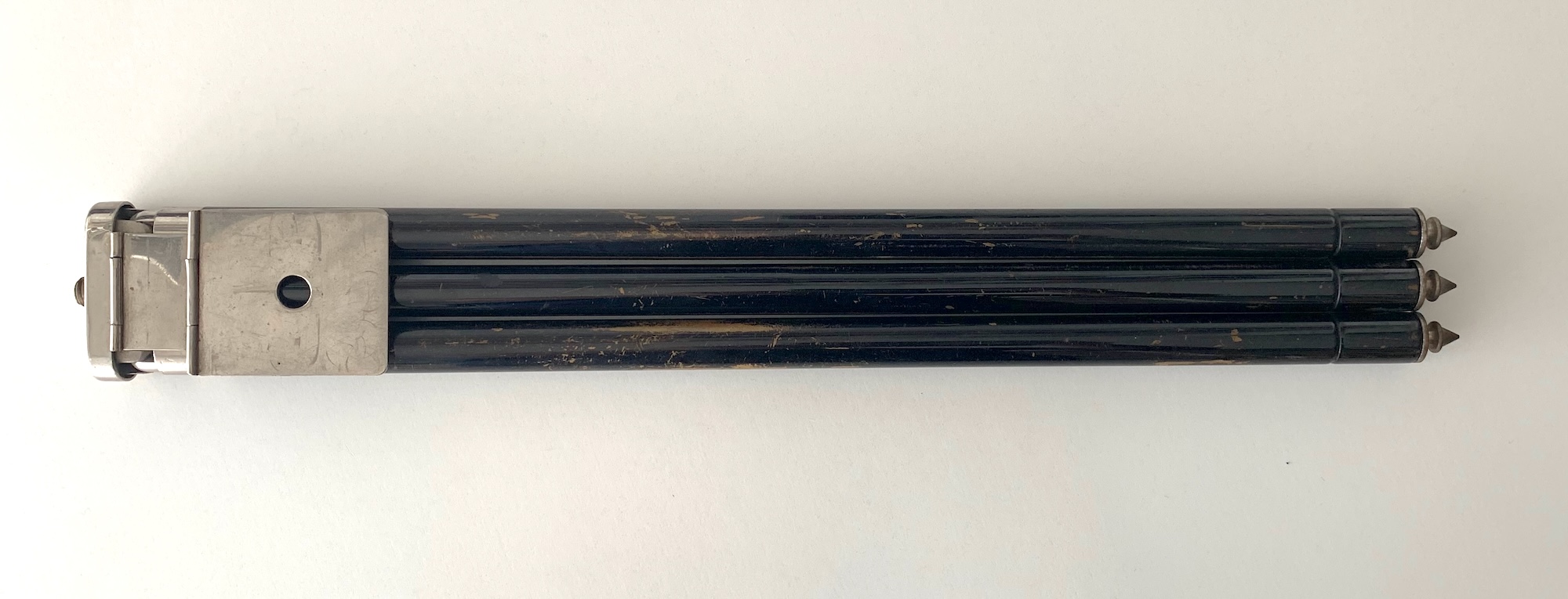 Es besteht aus ineinander liegenden Messingrohren, von denen das äußerste schwarz emailliert ist. Die Beine liegen im Transportzustand nebeneinander und lassen sich jeweils in einer bestimmten Richtung abklappen. Der Winkel ist nicht begrenzt, das Stativ ist im Prinzip also recht flexibel aufstellbar. Zur Fixierung auf dem Untergrund dienen die pickelartigen Füße. Die Kameraplatte ist umlegbar. Die Gewindeschraube kann umgesteckt werden und ist somit für beide Gewinde geeignet.