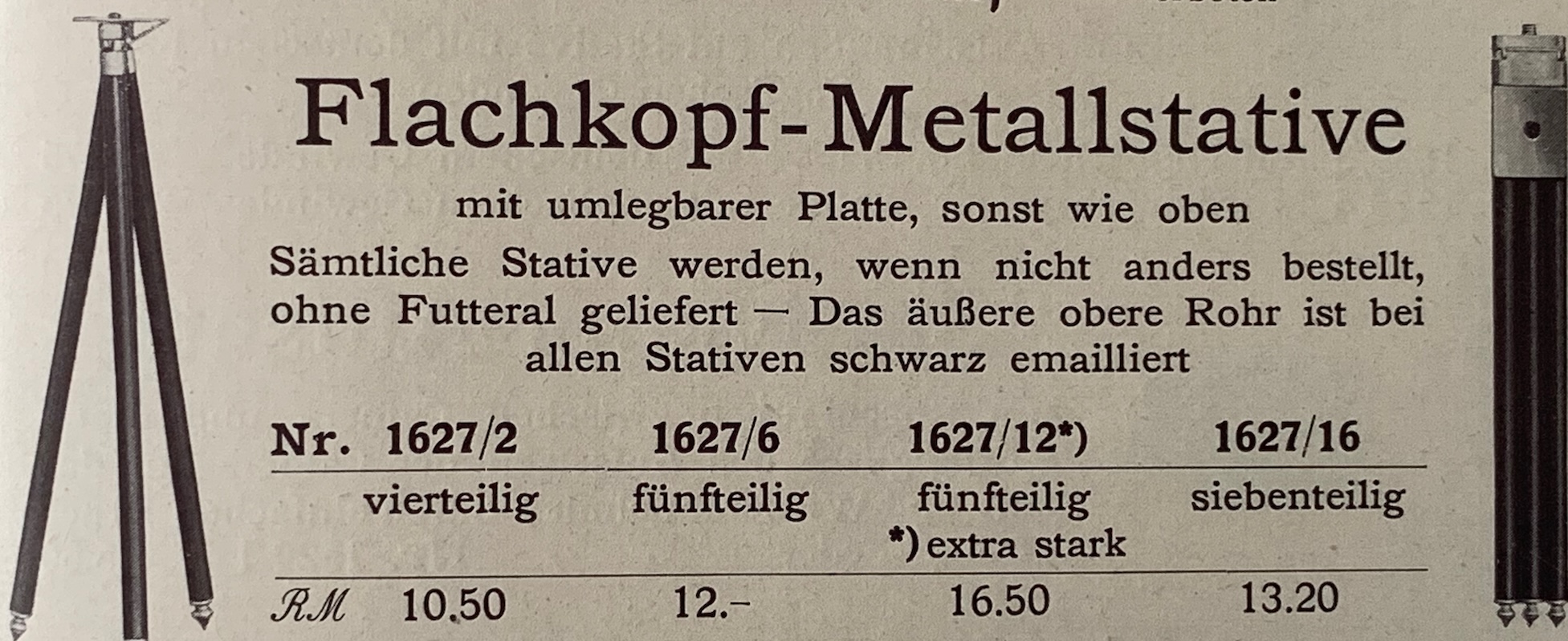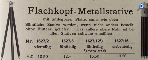 Das vorliegende Stativ besteht aus 5 Segmenten (Gesamtlänge: 1,47 m), die mit federnden Stiften arretiert werden. Im Transportzustand hat das Stativ eine Länge von 41 cm. – Lieferbar waren auch vier und siebenteilige Varianten. Das Stativ wurde auch ins Zeiss Ikon-Programm übernommen und erscheint im ersten Katalog (1927); dort wird es unter der Nummer 1627/6 geführt, der Preis beträgt 12 RM. Für 16,50 RM wird auch eine „extra starke“ Variante 1627/12 offeriert.