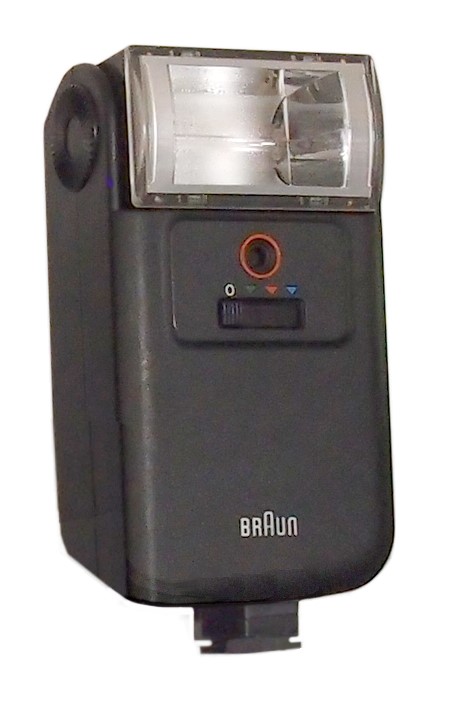 ein Elektronenblitzgerät von Braun: Vario Computer 2000 F022. Es kam um 1972 auf den Markt. Stromversorgung mit Akku oder Netzteil (Netzkabel 4 Meter lang). Aufladung erfolgt über Ladesockel. Synchron-Anschluß über Mittelkontakt oder Kabel. Leitzahl 22 bei 18 DIN. Blitzzeit 1/700 bis 1/20000 Sek.