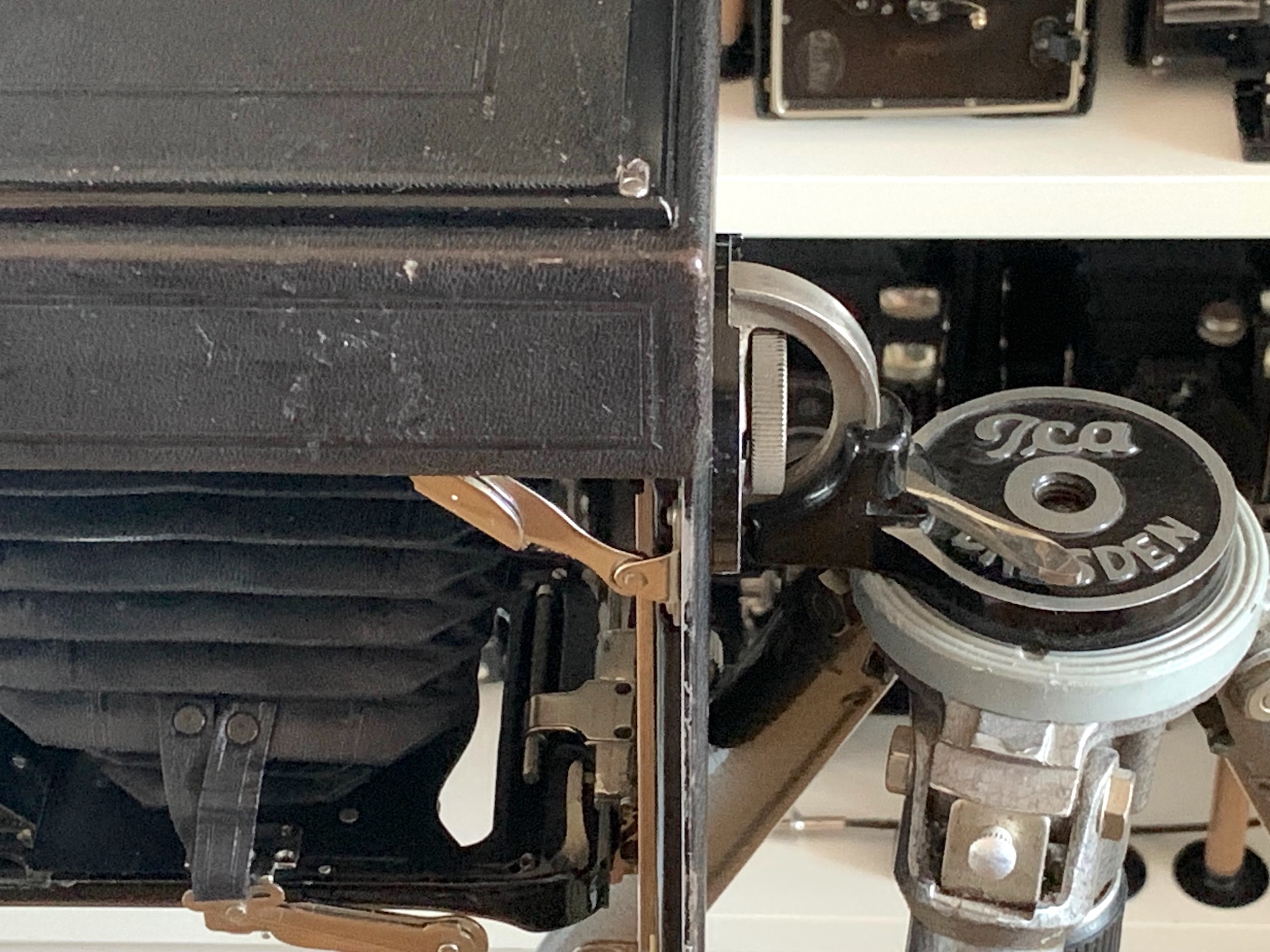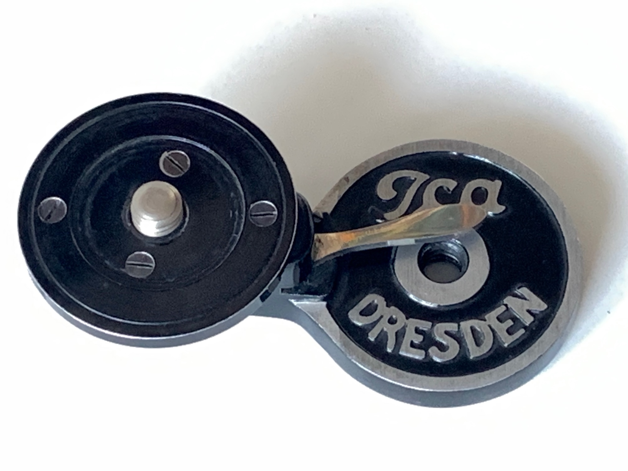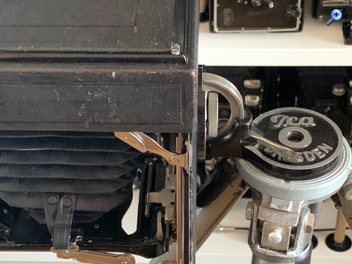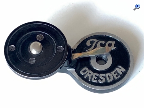 manchmal landen als Beifang unscheinbare Zubehörteile in der Sammlung, die auf den zweiten Blick recht interessant und es wert sind, hier einmal gezeigt zu werden. Dazu gehört der Camera-Neiger der Ica. Unter der Bestellnummer 1630/2 bzw. 1630/3 wurde ein Neigekopf angeboten, der es ermöglichte, die Kamera in einer Achse um bis zu 90° zu neigen und in jeder Position zu fixieren. Vorgesehen war der Neiger "für Decken-, Ballon- und Architektur-Aufnahmen". Es gab ihn in zwei Größen, in normaler und in "extrastarker Ausführung für Cameras bis 18x24". Maße sind nicht angegeben, aber es würde mich nicht wundern, wenn es sich beim vorliegenden Exemplar um die extrastarke Version handeln würde. Der Kopf ist massiv und grundsolide gefertigt und hält auch schwere Kameras. Zusätzlich ist ein Gewindeansatz dabei, der wohl zum Aufschrauben auf Kameras mit Holzgehäuse vorgesehen war.