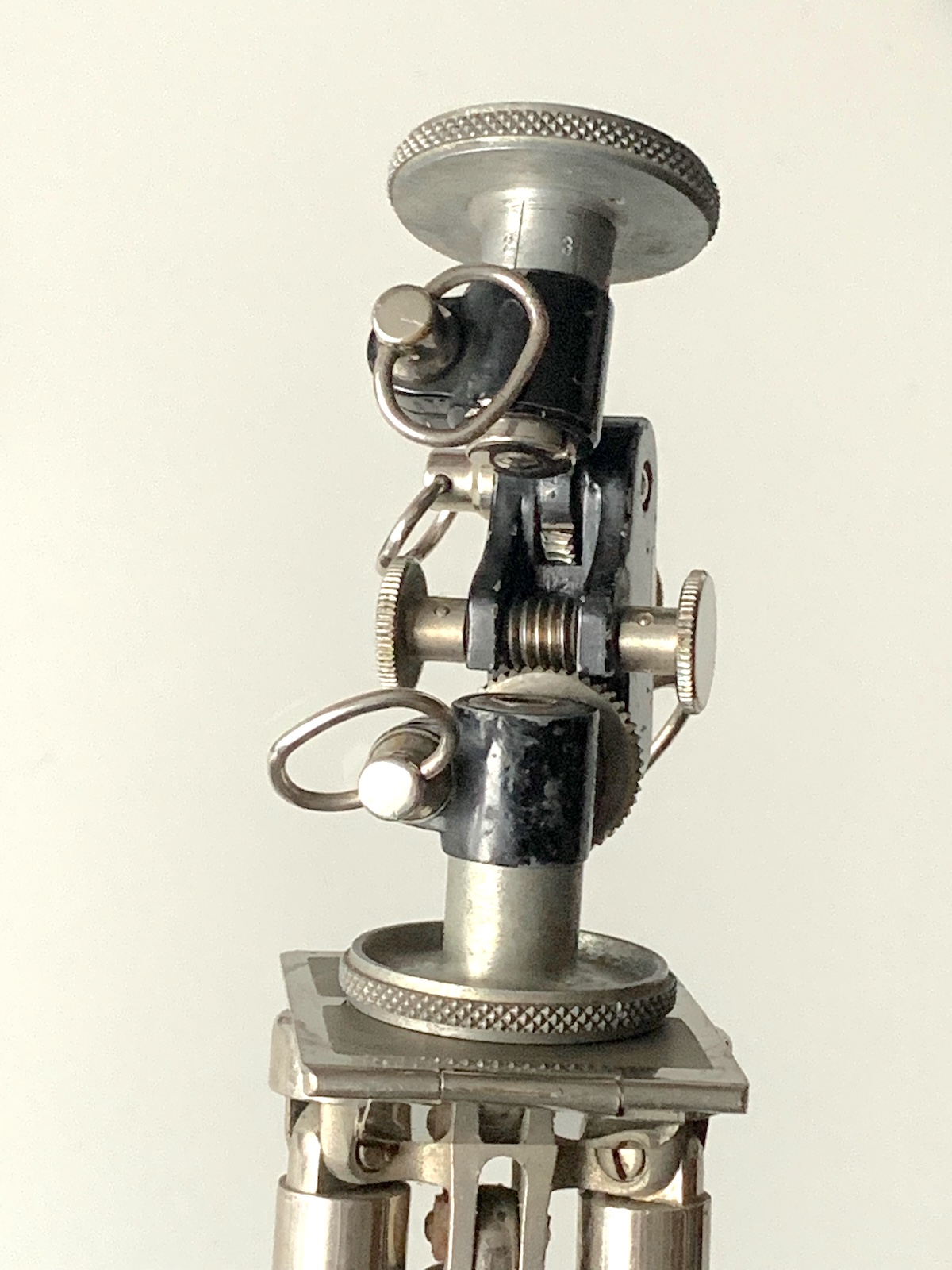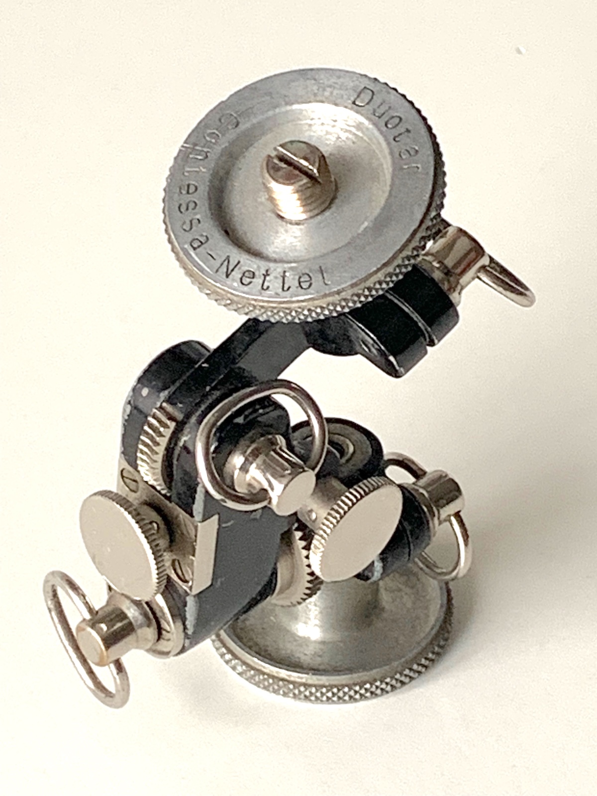 unter der Bezeichnung „Duotar“ brachte Contessa-Nettel vermutlich 1922 einen Stativkopf mit Mikrometereinstellung heraus, der die Arretierung der Kamera in jeder Position ermöglichte. Nun habe ich mich lange Zeit für diesen Bereich gar nicht interessiert, zumal die frühen Metallstative, wie man sie oft als Beifang bekommt, ja zumeist etwas wackelig sind. Mir ist aber aufgefallen, dass der Duotar – namentlich in der späteren Zeiss Ikon-Version – recht hohe Preise erzielt (z. B. hier: https://www.leitz-auction.com/de/Zeiss-I...1629/AI-5-23358), und in den frühen Zeiss Ikon-Katalogen ist es auch der einzige angebotene Stativkopf. Pritschow stellt den Duotar in seinem Standardwerk Die photographische Kamera und ihr Zubehör (1931) ausführlich inkl. Explosionszeichnung vor (S. 385–386). Daher schien mir eine nähere Beschäftigung damit lohnend, und als nun in den Kleinanzeigen ein Exemplar günstig angeboten wurde, habe ich zugegriffen.